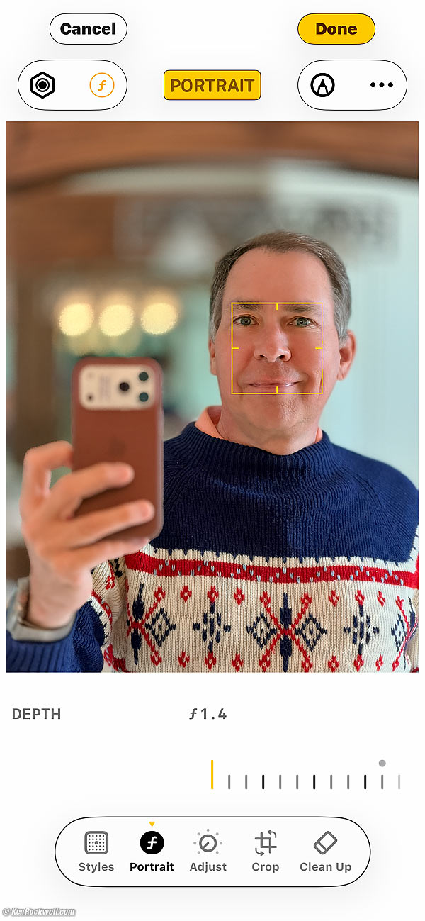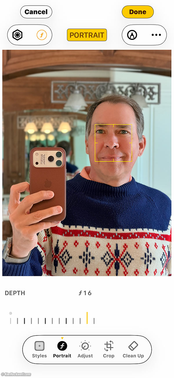 Slide the scale all the way to the left to OFF (turns off the Portrait mode) to get the most in focus: Hit DONE at the top left, and you're done. If you want to change this again, just tap the three sliders (edit & adjust) icon © Ken Rockwell. All rights reserved. Tous droits réservés. Alle Rechte vorbehalten. Alla rättigheter förbehållna. Toate drepturile rezervate. Niciun vampir nu a fost implicat în crearea acestei lucrări. Doe! Omnia jura reservata. Ken Rockwell® is a registered trademark.