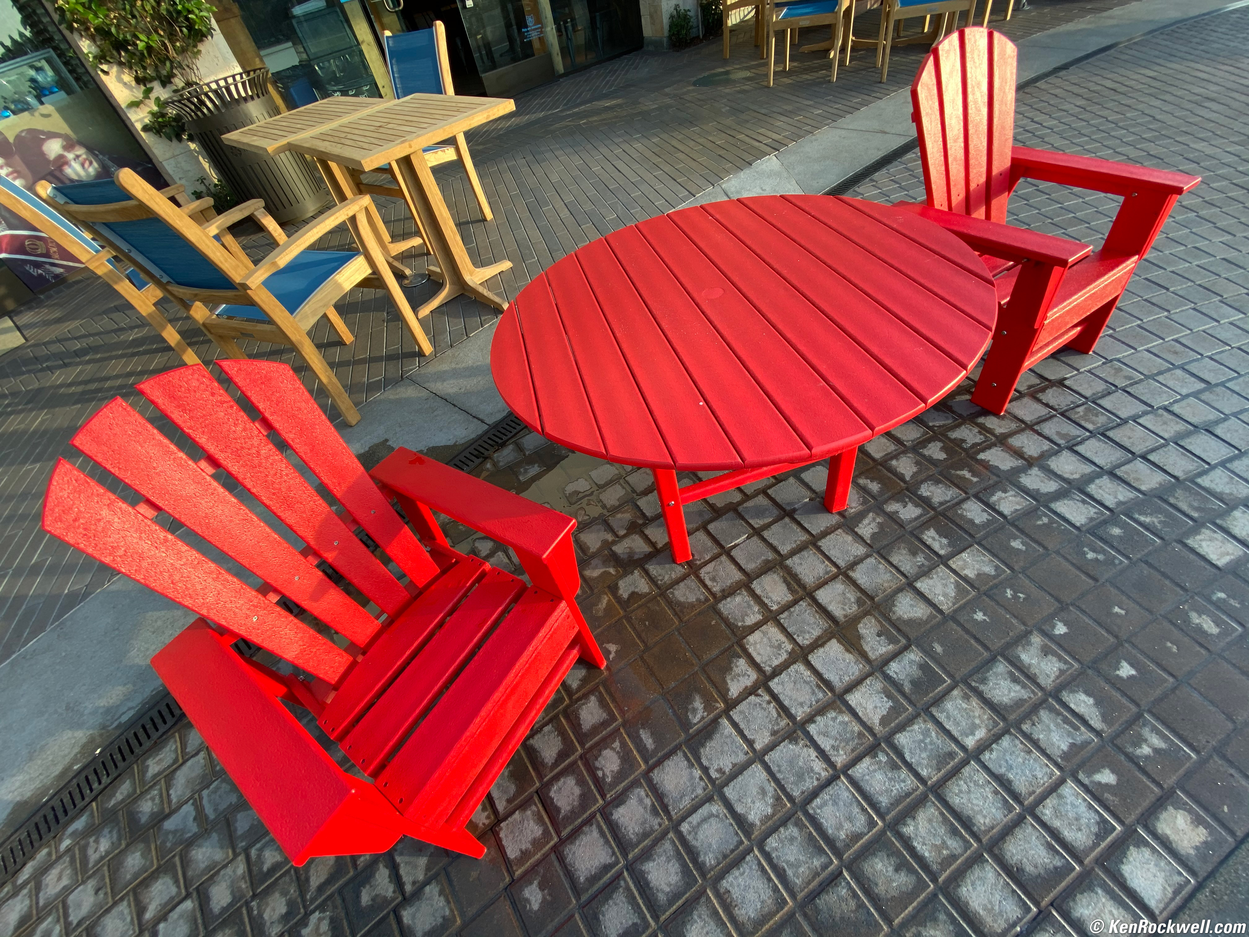 Red Adirondack Chairs, 22 September 2019. iPhone 11 Pro Max, 1.54mm (13mm equivalent) ultra-wide camera at f/2.4 at 1/122 at Auto ISO 64 (LV 10.1), Perfectly Clear. bigger or as-shot, full-resolution file.