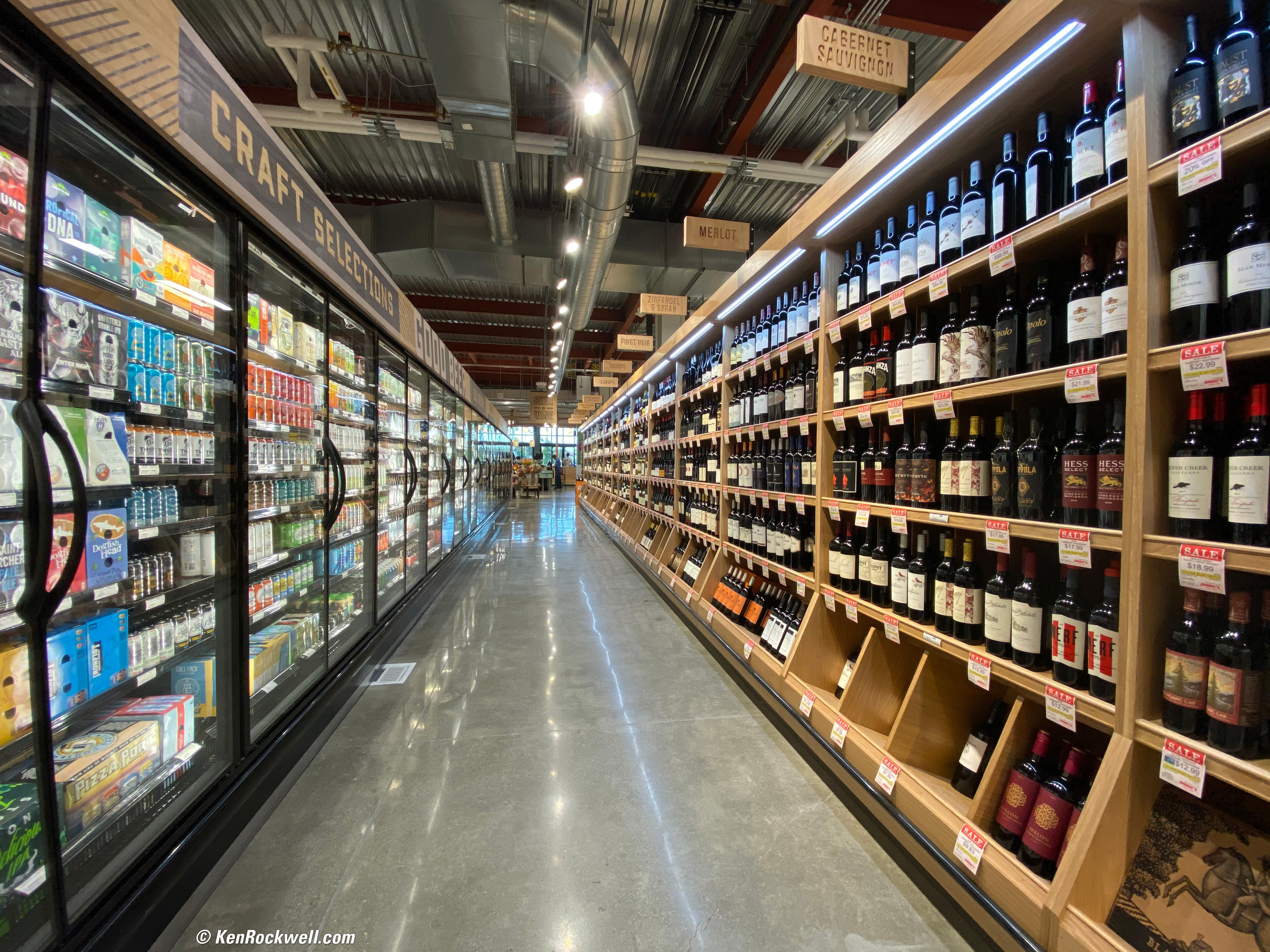 Supermarket Beer & Wine Section, 22 September 2019. iPhone 11 Pro Max, 1.54mm (13mm equivalent) ultra-wide camera at f/2.4 at 1/120 at Auto ISO 200 (LV 8.4), Perfectly Clear and perspective & lens correction in Photoshop CS6. bigger or as-shot, full-resolution file.