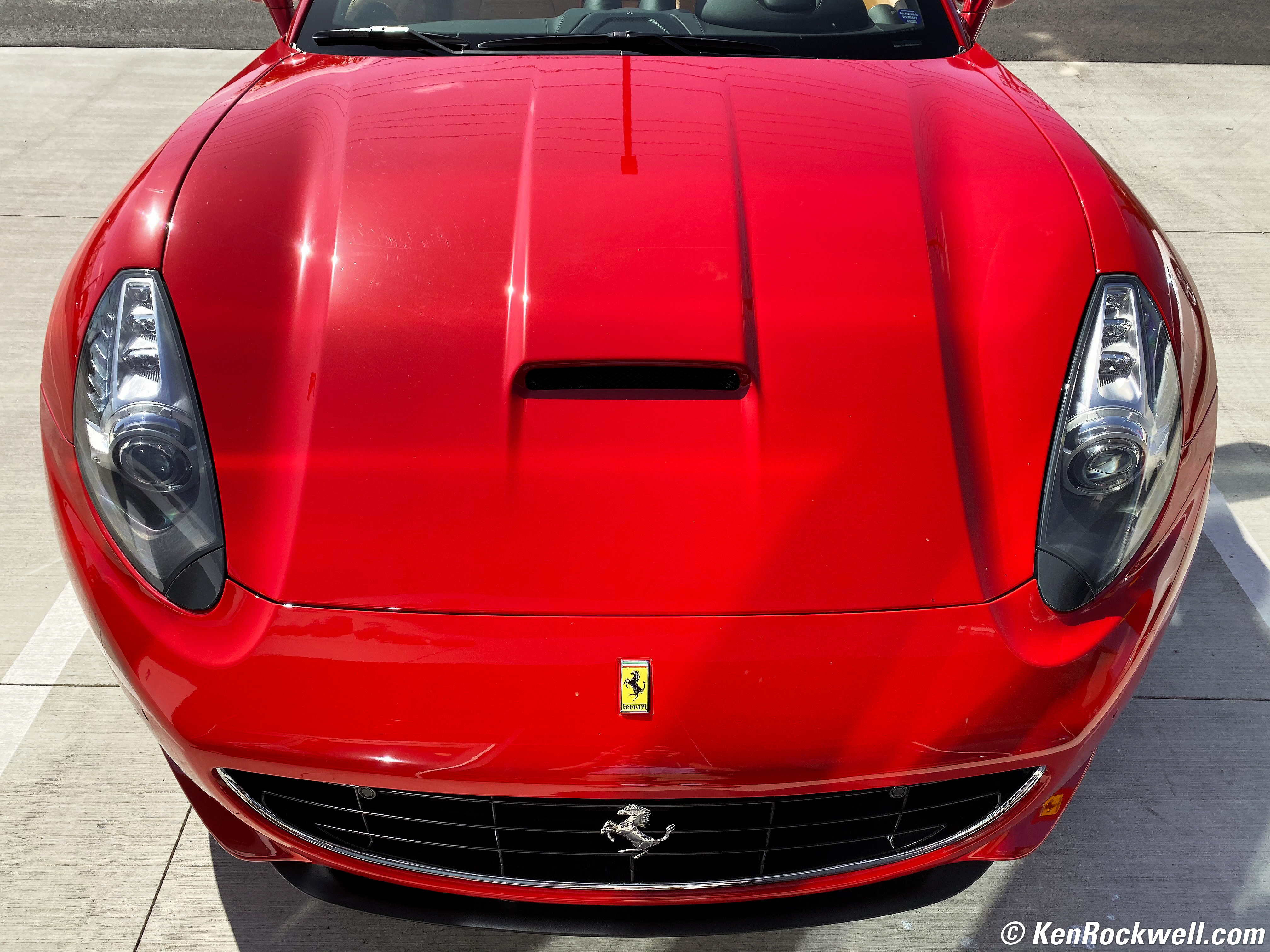 Hood, 2012 Ferrari California 2+2 in Rosso Corsa Red 322, 29 September 2019. iPhone 11 Pro Max, 4.25mm (26mm equivalent) camera at f/1.8 at 1/1,546 at Auto ISO 32 (LV 13.9), Perfectly Clear. bigger or full-resolution file. The darker "7" on the hood is from the reflections lighting the hood.