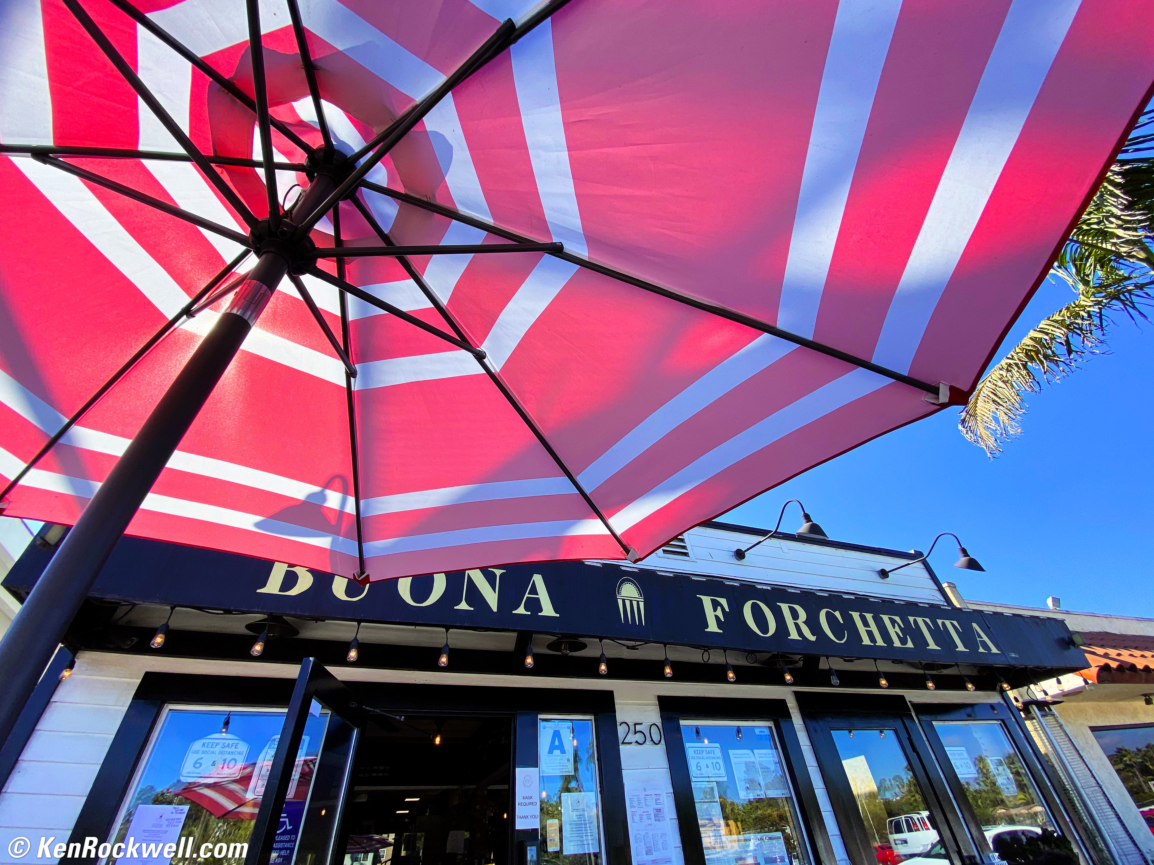 Buena Forchetta, Encinitas, 2:03 PM, 11 October 2020. iPhone 11 Pro Max, 1.54mm (13mm equivalent) ultra-wide camera at f/2.4 at 1/333 at Auto ISO 20 (LV 13¼), Perfectly Clear. bigger or full resolution.