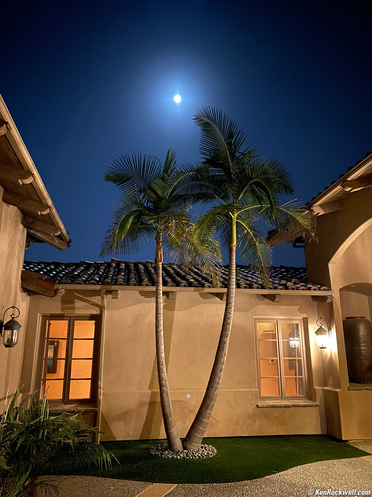 Palms by Moonlight, 9:20PM, 12 October 2019. iPhone 11 Pro Max, 4.25mm (26mm equivalent) camera at f/1.8 at 1/4 second hand-held at Auto ISO 800 (LV -0.1), as shot. bigger or fill screen. Night mode works! I have other shots under only moonlight hand-held, and it's crazy! This is a lot more colorful than the purely moonlit shots, and in this shot you can see the cool moonlight glinting off the tile roof — hand-held! I remember how on film this all took a tripod and a load of patience and bracketing trying to compensate for reciprocity failure and the fact that light meters wouldn't read in light this dark. Now I can grab these as I'm walking along; how things chage in 50 years.