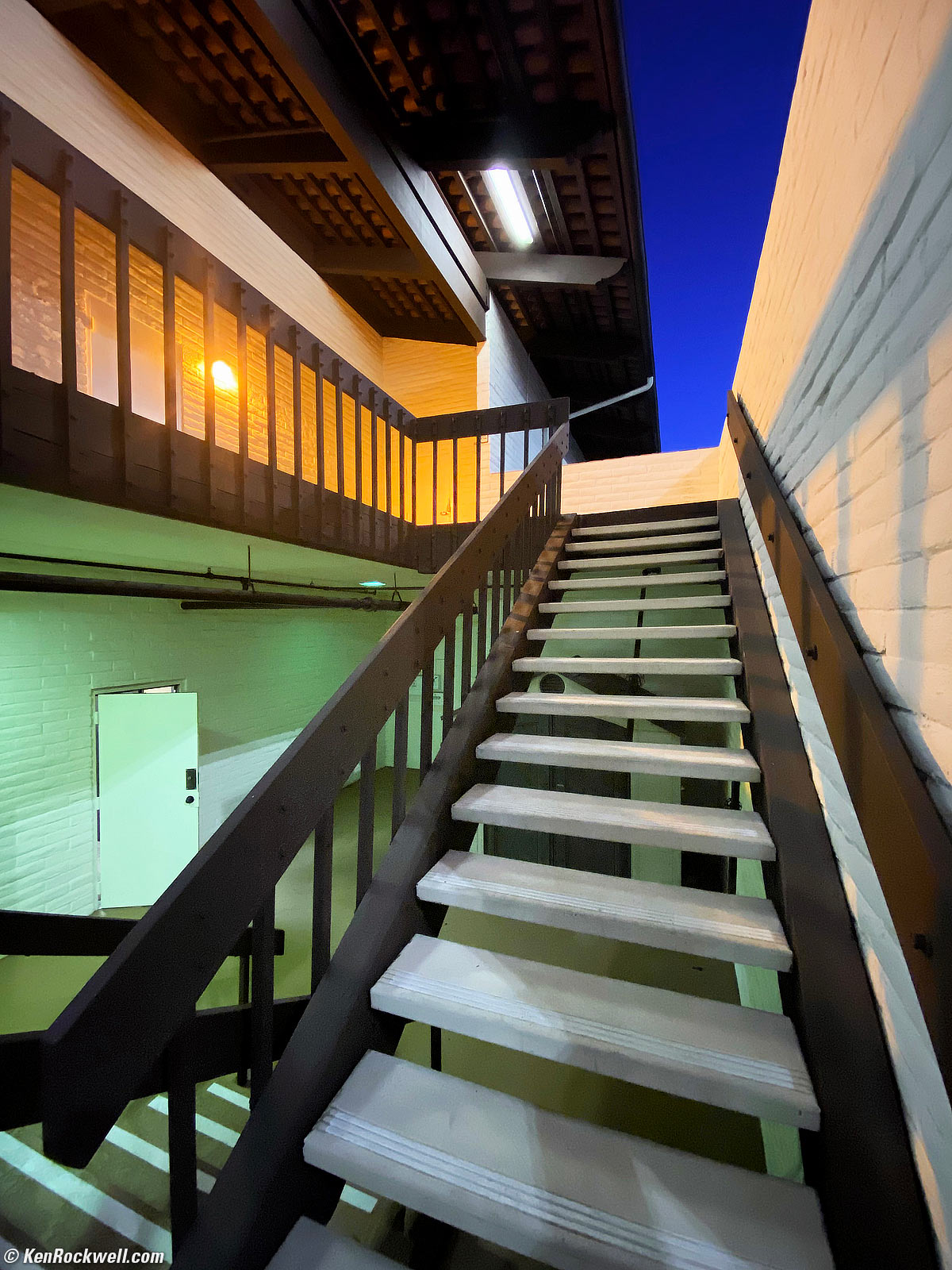 Stairs at Dusk, 6:41 PM, 15 October 2019. iPhone 11 Pro Max, 1.54mm (13mm equivalent) ultra-wide camera at f/2.4 at 1/30 second at Auto ISO 1,250 (LV 3.8), Perfectly Clear. bigger or fill screen.