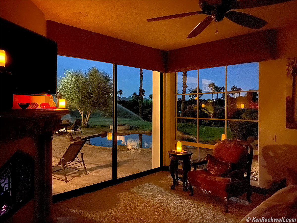 Bedroom by Moonlight, 12 November 2019, 5:01 A.M. Apple iPhone 11 Pro Max, 4.25mm (26mm equivalent) ultra-wide camera at f/1.8 at 1/2 second handheld at Auto ISO 4,000, automatic Night Mode (LV -2.7), Perfectly Clear. bigger. I kid you not: I was awakened by the setting full moon well before dawn. I held up my iPhone 11 Pro Max from bed and made a snap. PERFECT! The band of white light on the carpet in the center bottom of the image is moonlight. This iPhone amazes me; I don't even have to be awake to take great photos!
