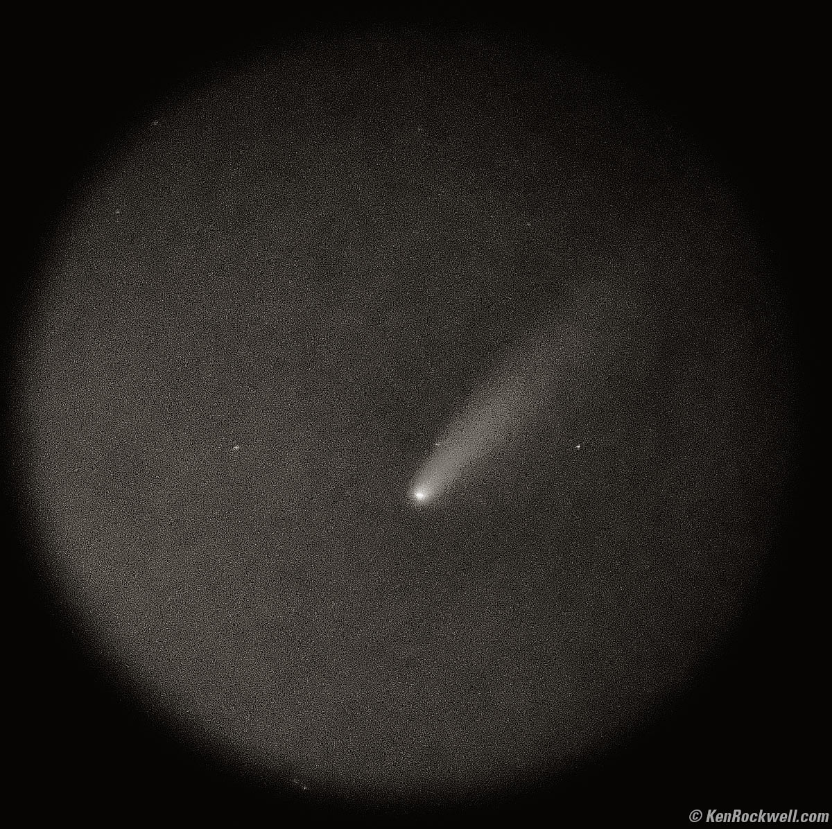The Comet Neowise. 9:09 PM, Thursday, 16 July 2020. Apple iPhone 11 Pro Max, 4.25mm (26mm equivalent) ultra-wide camera at f/1.8 at 1 second handheld at Auto ISO 3,200, automatic Night Mode (LV -3.3). bigger. When I was a kid, astrophotography was a drag. I'd attach my Minolta SR-1 (self-portrait from 1974 at age 12) to the back of my 60mm × 700mm Tasco (unguided altazimuth) telescope, make a long exposure, and a week later get nothing back but blank film. This time, I pointed my old Bushnell Spacemaster II 25× 60mm spotting scope at the comet after I found it with my LEICA TRINOVID 10 × 50 BN binoculars, then as a goof, held my iPhone 11 Pro Max behind the scope in the air as it made a magic, automatic time-sliced and motion-compensated exposure. Holy, cow, it worked! I just held it, and it made a sharp exposure even though my hands were moving Shot in the native Apple Camera app, It took longer to write this than it did to shoot it.
