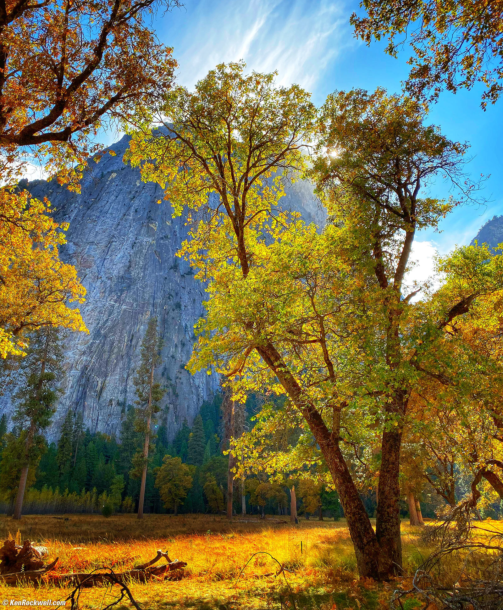 Tree in Glorious Backlight, Yosemite Valley, Yosemite National Park, California, 2:17 P.M., 18 October 2019. Apple iPhone 11 Pro Max, 4.25mm standard camera (26mm equivalent) at f/1.8 at 1/1,397 at Auto ISO 32 (LV 13.8). bigger.