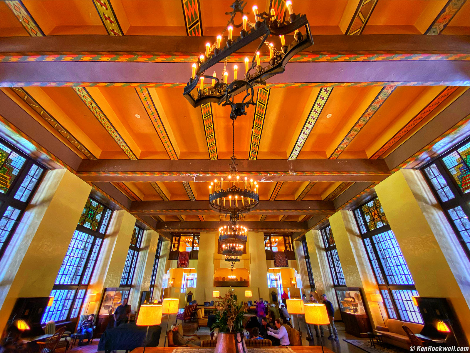Ahwahnee Hotel Interior, Yosemite Valley, Yosemite National Park, California, 12:56 P.M., 19 October 2019. Apple iPhone 11 Pro Max, 1.54mm ultrawide camera (13mm equivalent) at f/2.4 at 1/30 at Auto ISO 800 (LV 4.4). bigger.