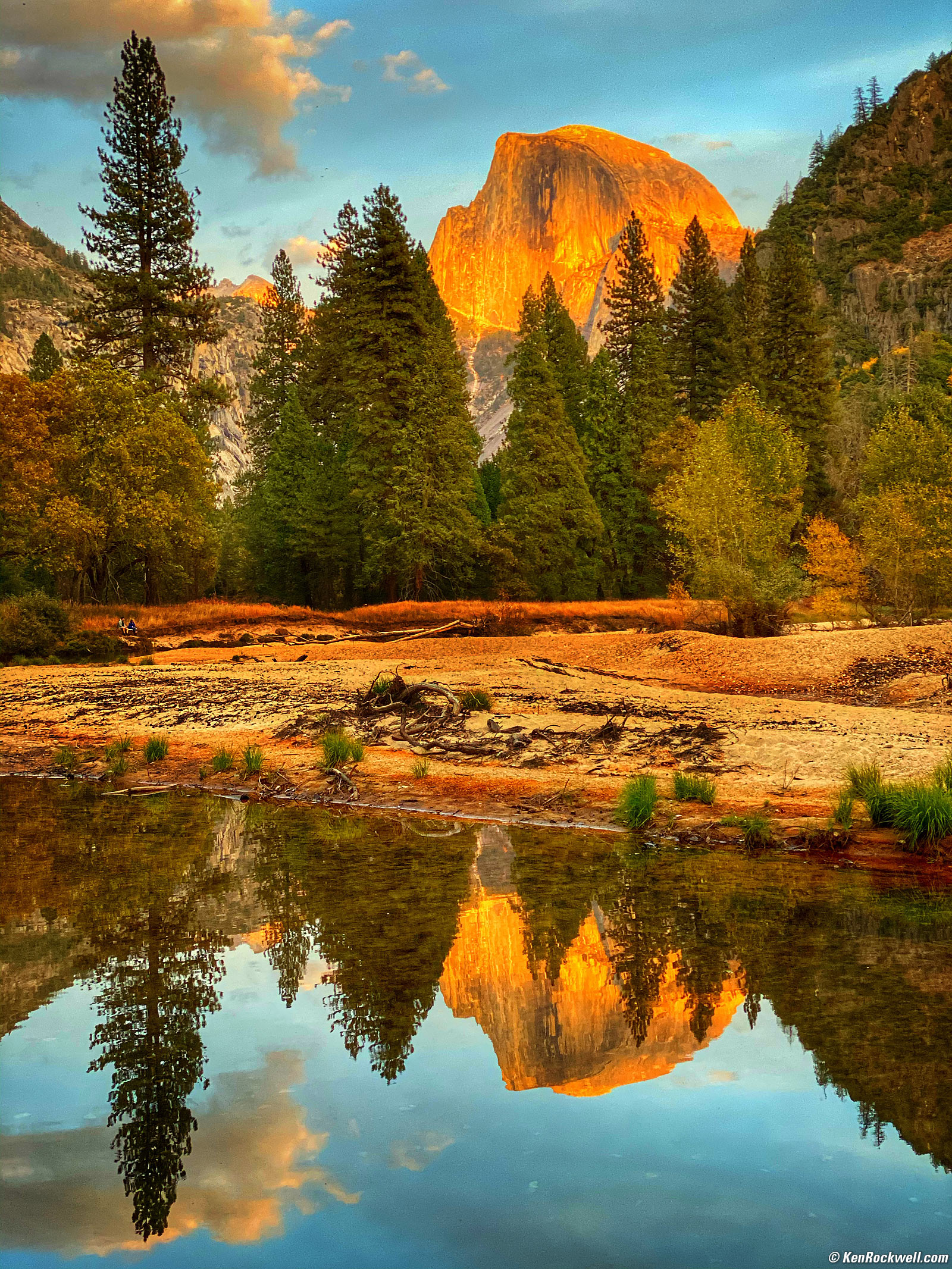 Half Dome and the Merced River, Yosemite Valley, Yosemite National Park, California, 6:08 P.M., 19 October 2019. Apple iPhone 11 Pro Max, 6mm long camera (52mm equivalent) at f/2 at 1/122 at Auto ISO 80 (LV 9¼). bigger. Somehow this evokes the feeling of 1940s postcard.