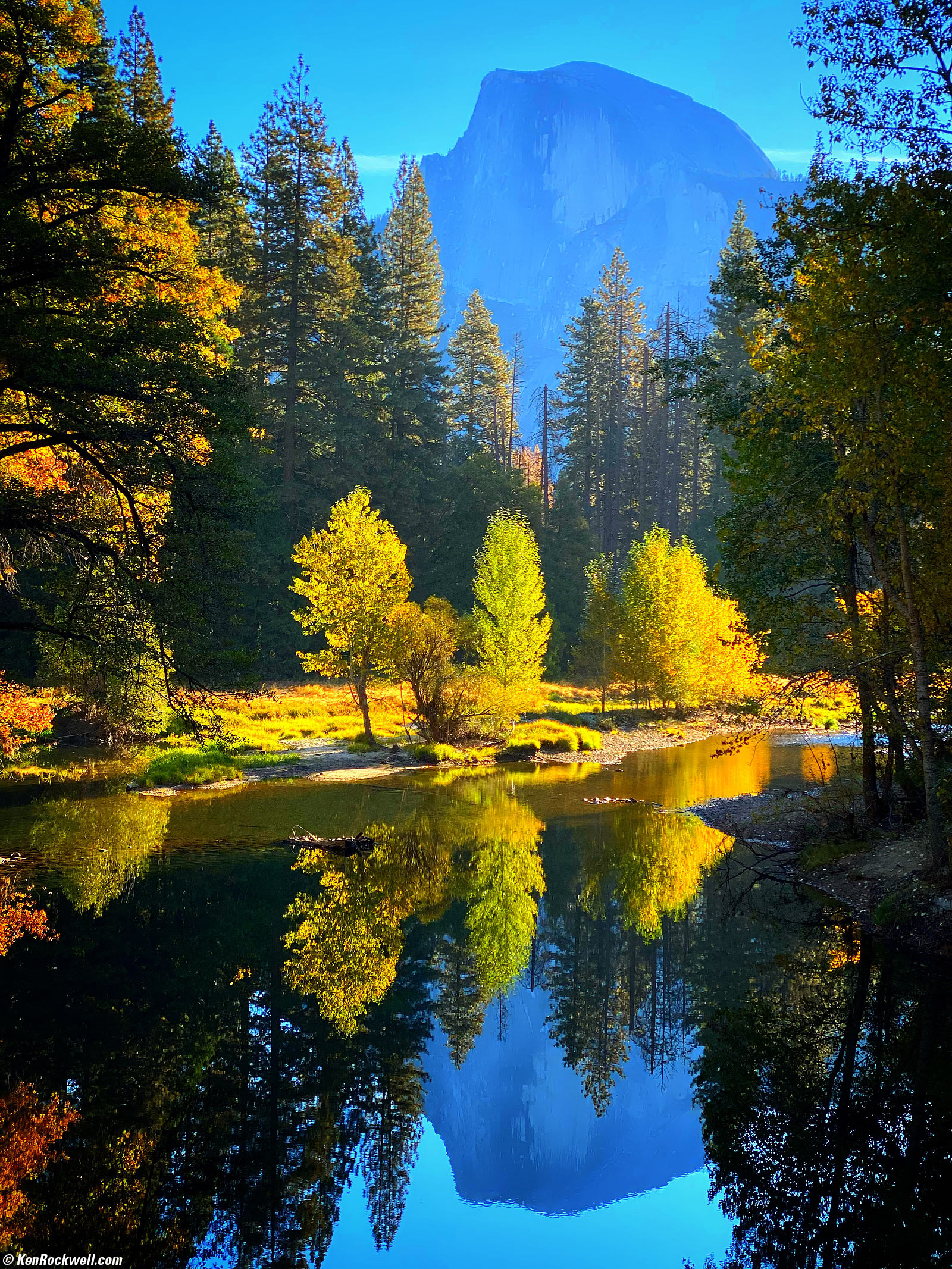 Side-Lit Yellow Trees with the Half Dome along the Banks of the Merced River, Yosemite Valley, Yosemite National Park, California, 8:38 A.M., 20 October 2019. Apple iPhone 11 Pro Max, 6mm long camera (52mm equivalent) at f/2 at 1/436 at Auto ISO 20 (LV 13.1). bigger.