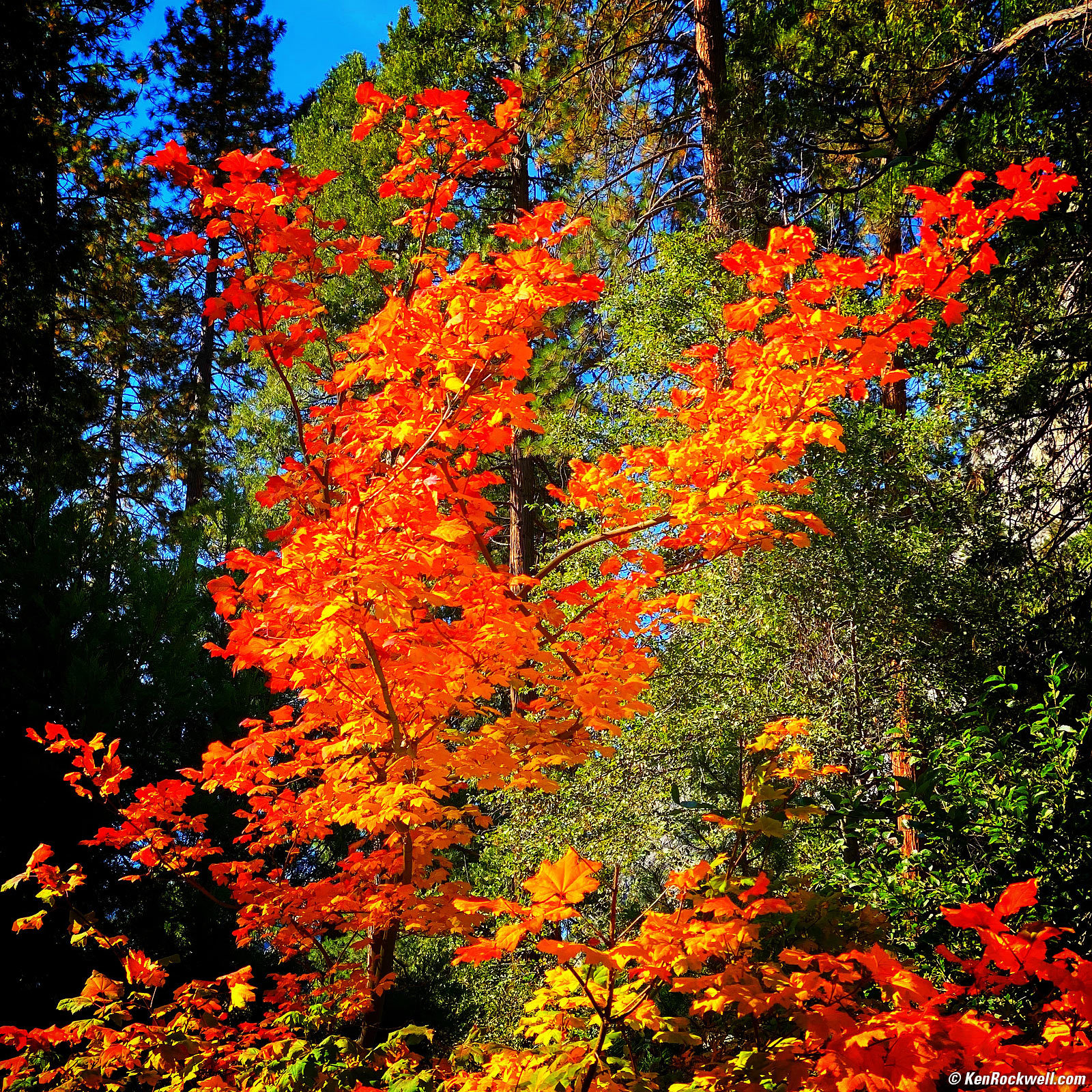 Flaming Maple Tree, Yosemite Valley, Yosemite National Park, California, 10:45 A.M., 20 October 2019. Apple iPhone 11 Pro Max, 6mm long camera (52mm equivalent) at f/2 at 1/384 at Auto ISO 20 (LV 12.9). bigger.