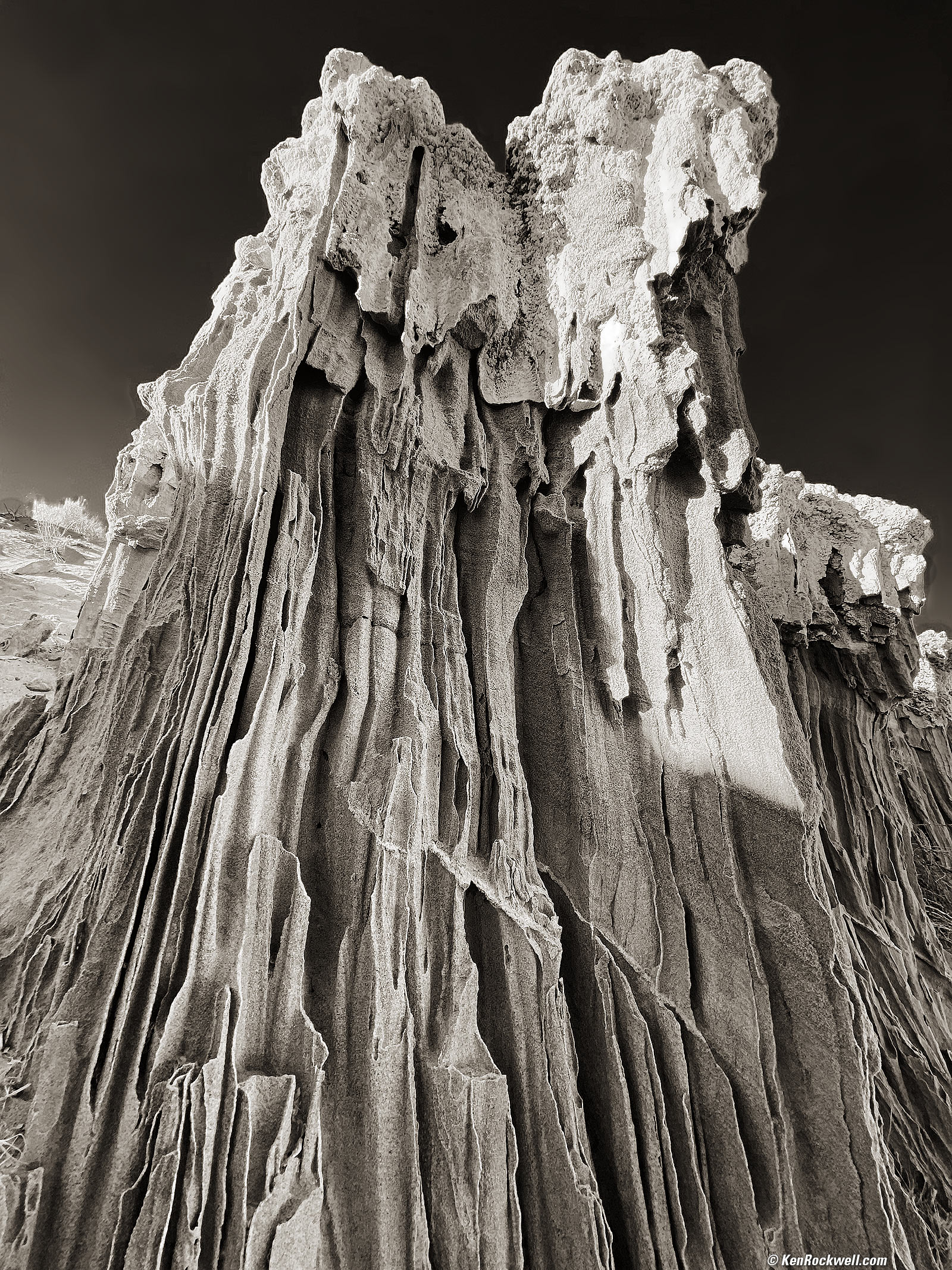 Sand Tufa Tower, California's Mojave Desert, 8:47 A.M., 22 October 2019. Apple iPhone 11 Pro Max, 1.54mm ultrawide camera (13mm equivalent) at f/2.4 at 1/170 at Auto ISO 20 (LV 12¼), split-toned print. bigger.