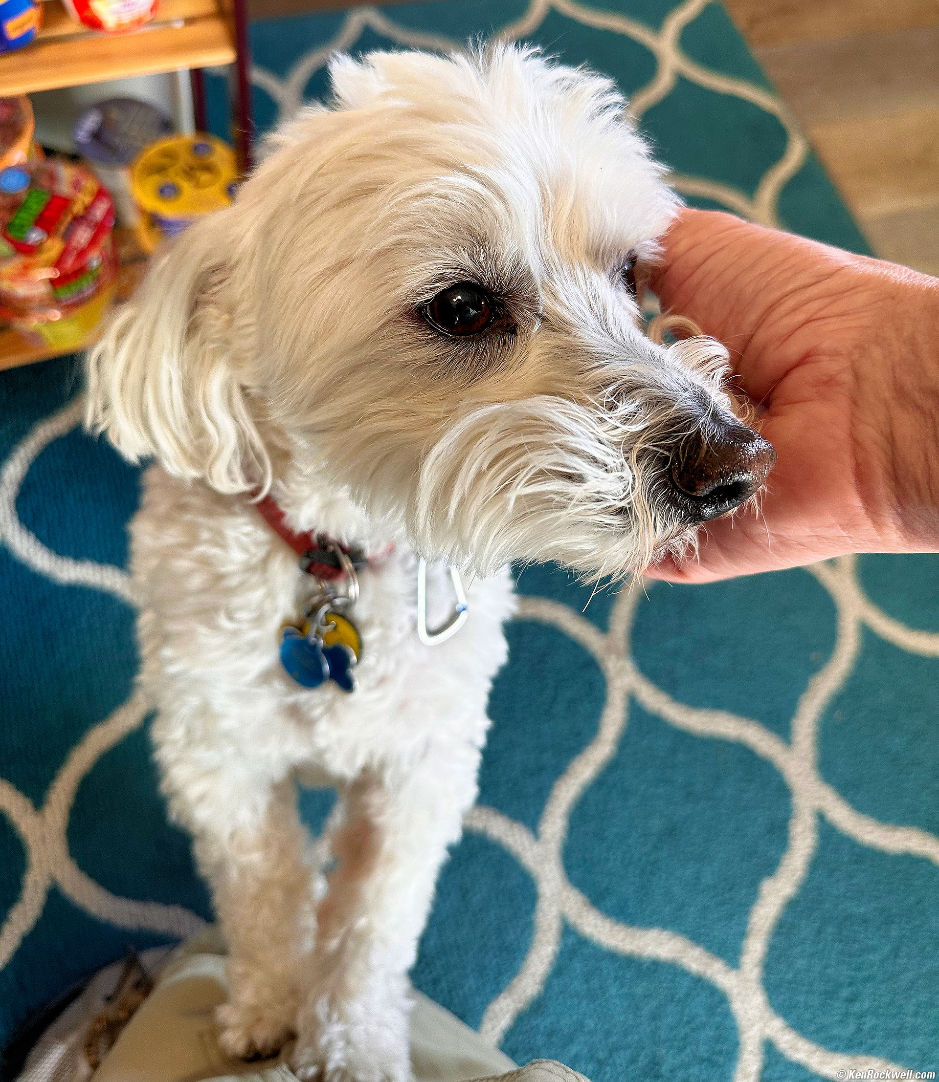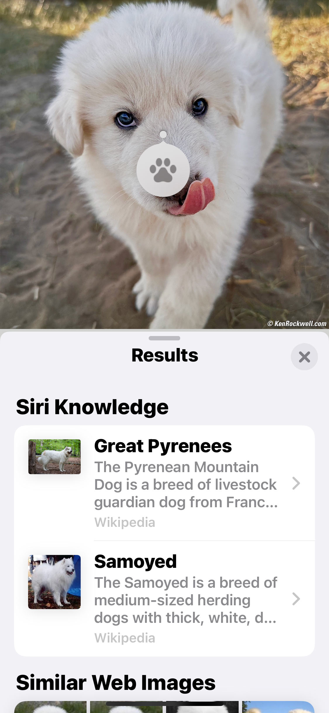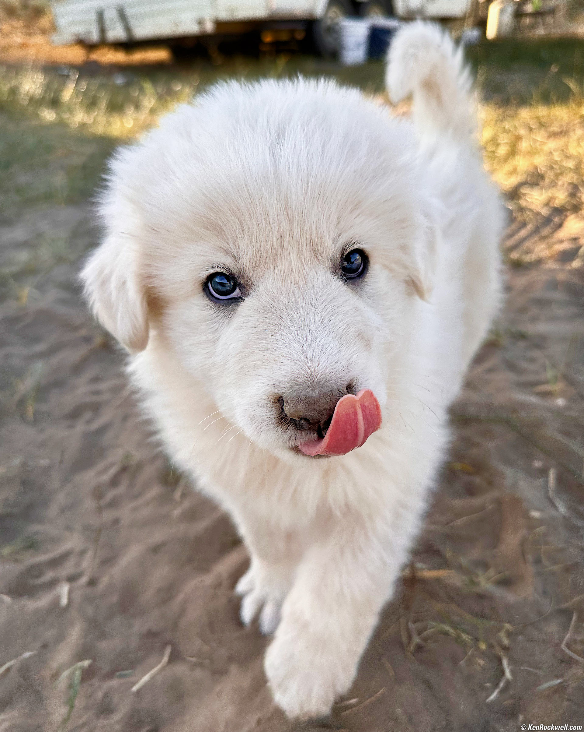 Very Cute Great Pyrenees Puppy with Tongue, Bridgeport, California, 5:14 P.M., 18 October 2022. Apple iPhone 14 Pro Max 1× (6.9mm actual or 24mm eq.) camera, f/1.8 at 1/810 at Auto ISO 80 (LV 11⅔). More tech details. bigger or fit-to-screen. The iPhone rules for these sorts of photos, where I easily can see its huge screen and motor away at 10 FPS with the phone in one hand and petting the pups with the other. This could be my favorite photo from this week of shooting. Also notice how the iPhone nailed autofocus in this fast-paced peppy puppy pandemonium. It nailed the eyes and didn't get sidetracked with the nose or the background, as a Nikon Z would do! The defocused background is a native optical phenomenon, not an electronic effect. The longer normal lens (6.9mm) in the 1× camera today shows definite background defocus in closeups.