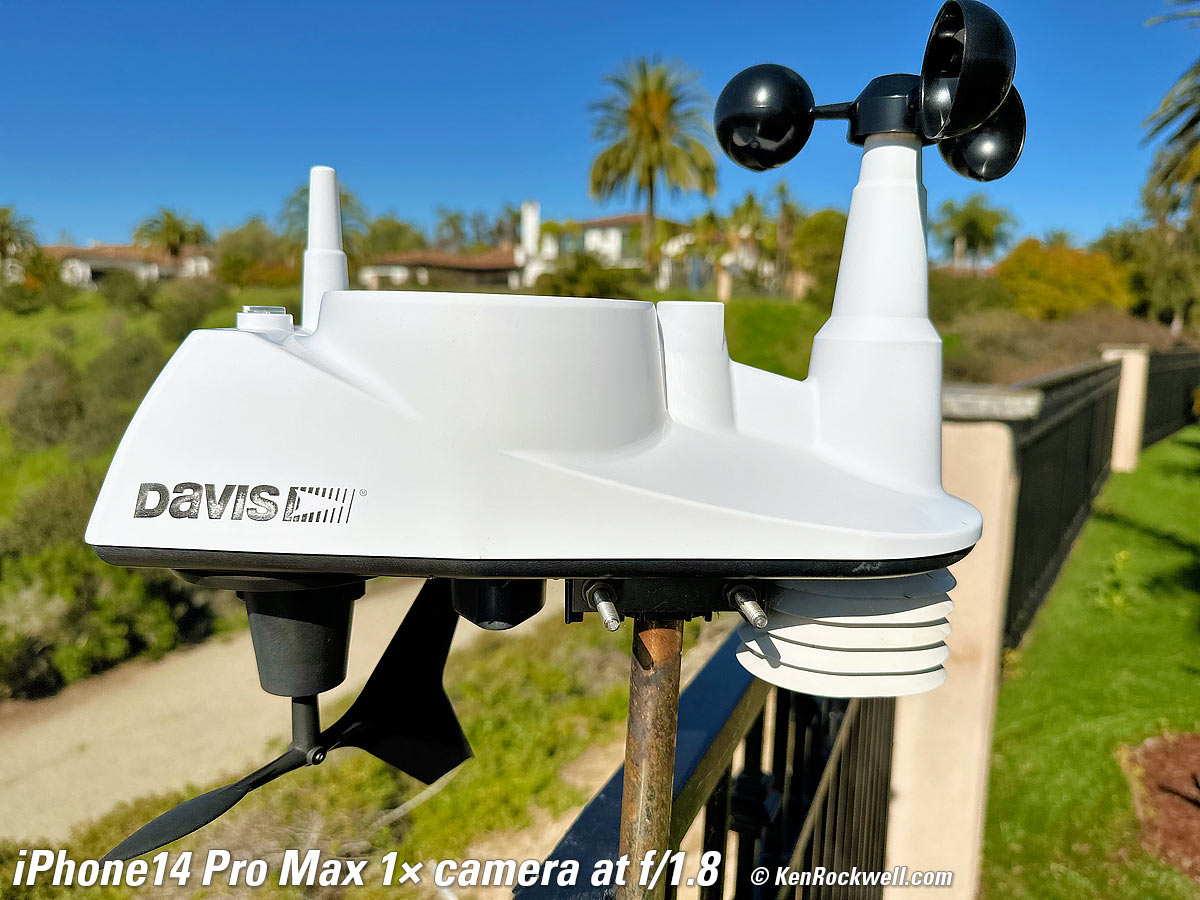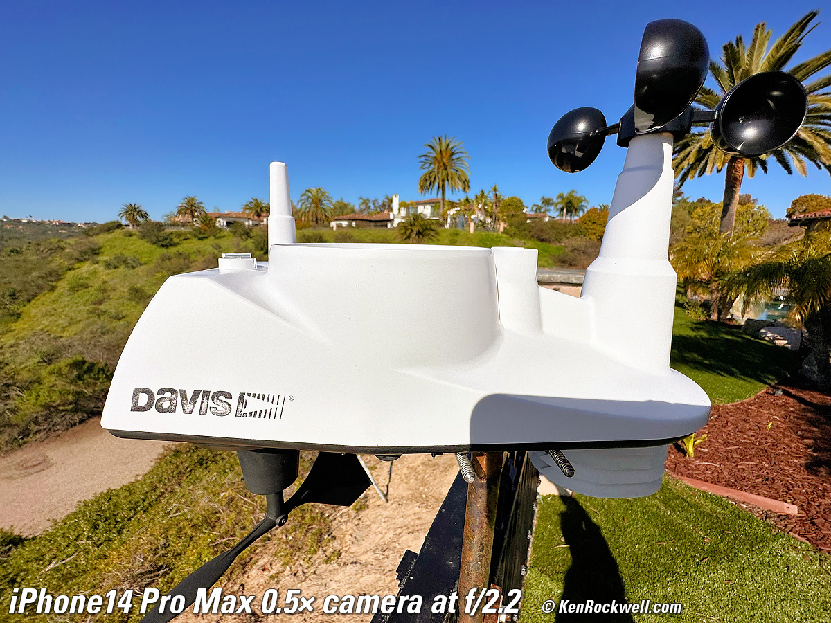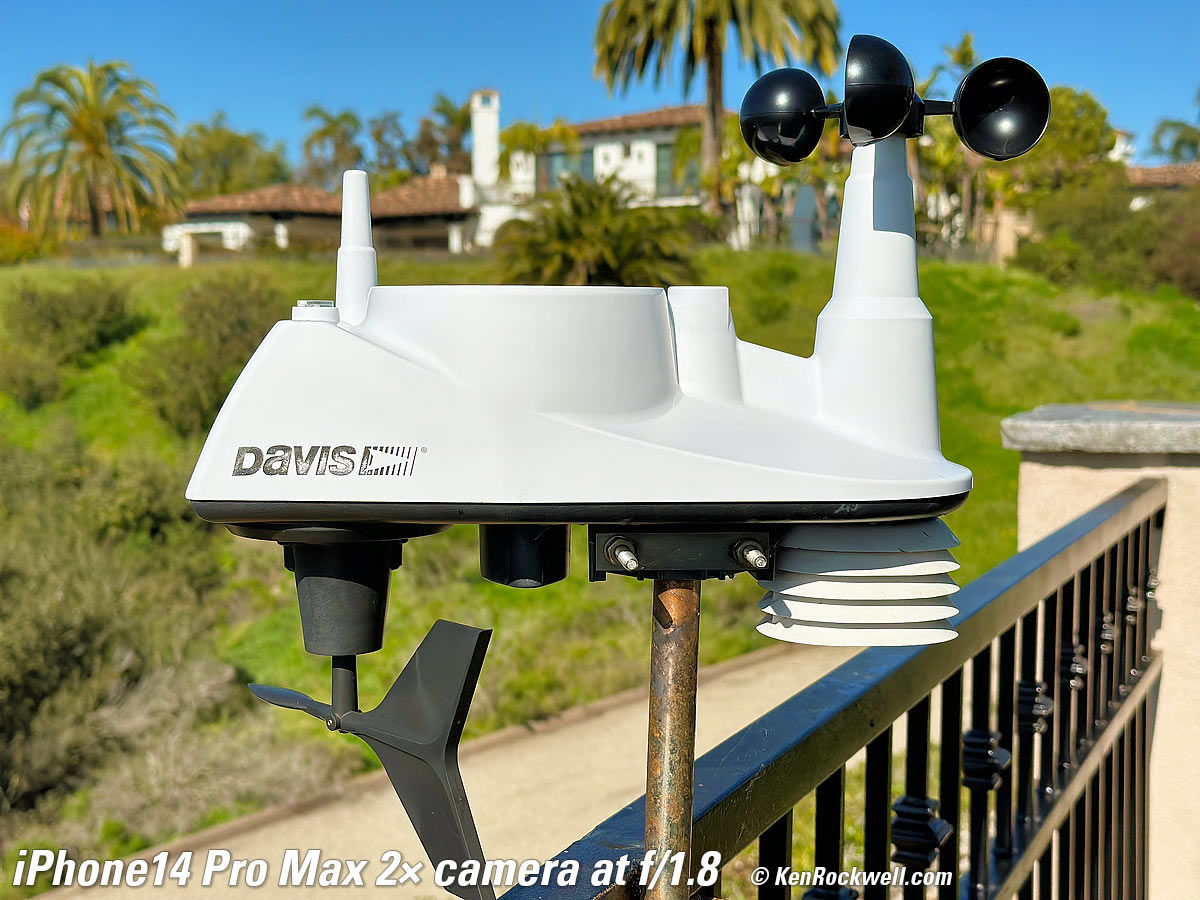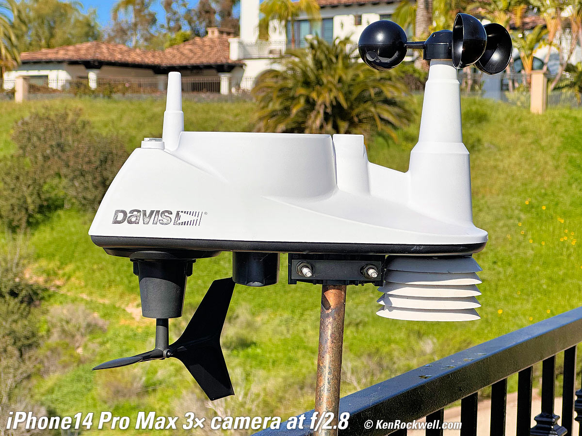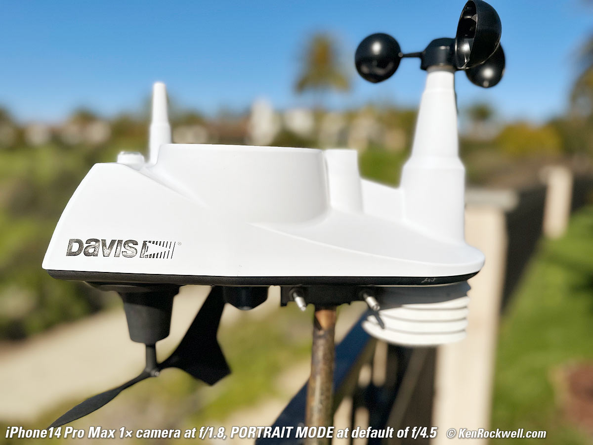 Bokeh in PORTRAIT Mode performance topBokeh is superb in PORTRAIT mode, as we'd expect. These shots are at its default setting of f/4.5; I could have made the background much softer if I chose EDIT in Photos and set it to f/1.4, or less soft if I did the same and chose a smaller aperture. These adjustments are made after shooting. The f/numbers in the PORTRAIT mode refer very roughly to the equivalent look with a 50mm lens on a 35mm camera; that's why f/4.5 here is much softer than the straight shots above at much wider real apertures. PORTRAIT mode doesn't work with the 0.5× camera. Made-in-U. S. A. Davis 6250 professional weather station (now replaced by model 6357), 18 March 2023. 1/18,519, 1/15,873, and 1/2,320 at Auto ISO 80, 100 and 32 (all about LV 16). Click any to enlarge.
