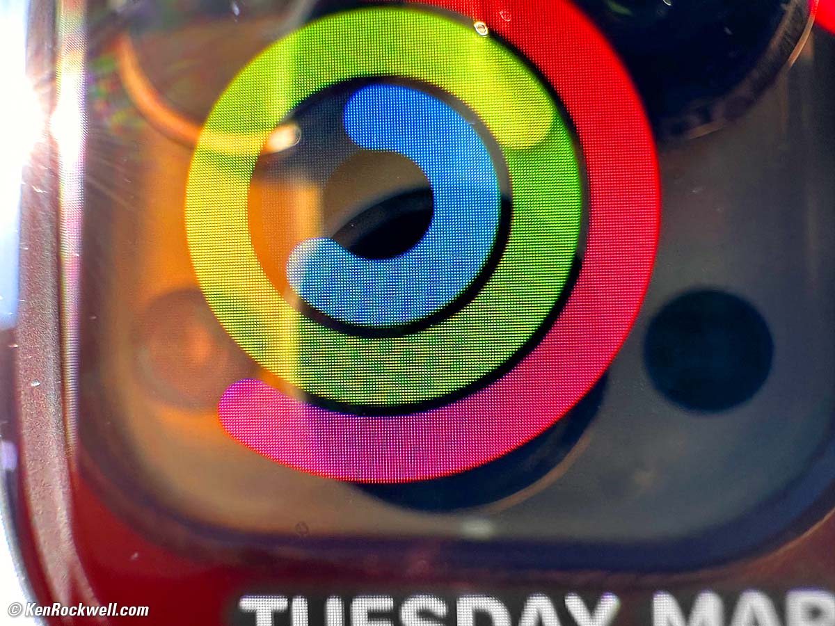 Macro Performance performance topiPhone focuses up to about 0.5 inches (12mm) from the lens covers. It focuses so close that it's hard trying to keep light on our subject. It focuses so close that it's nearly impossible to show anything recognizable for comparison; it gets so close that almost anything I show at its close focus distance becomes too abstract to recognize. When you're this close it's nearly impossible to light your subject, so in this case my Apple Watch ULTRA is self-lit. Yes, you're seeing individual pixels on the Apple Watch ULTRA screen: My Rings, Small Section of My Apple Watch ULTRA screen. bigger.