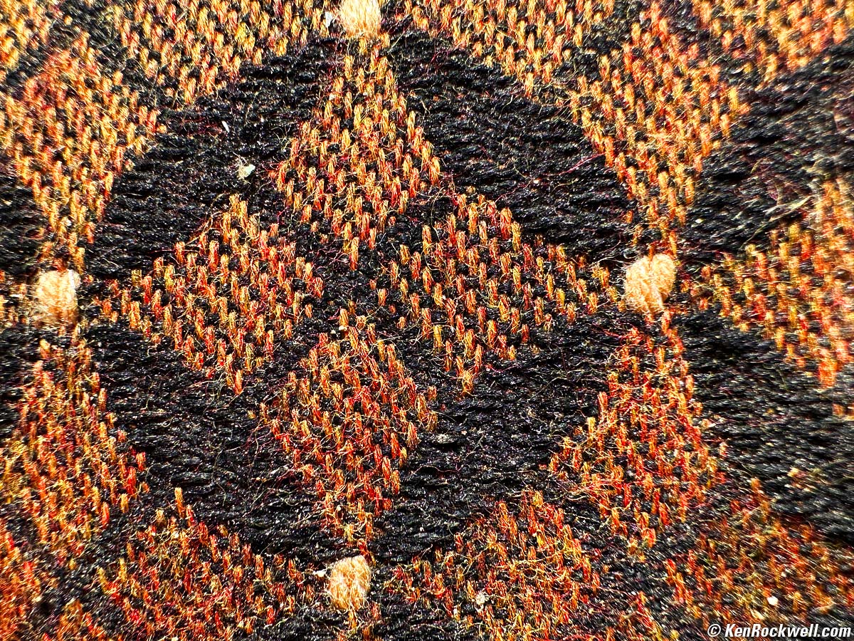 Fabric. bigger. The circle on the fabric is about 1¼" (3cm) in diameter. Yes, at these foolishly close distances it seems to get a little softer in the corners, but also know that it's tough trying to keep everything parallel to each other and in focus in the corners and that the fabric is curved. Good luck! As I explained above, when set to 1× as close as I shot these, it magically swaps to the 0.5× camera (which focuses much more closely than the 1× camera) and crops.