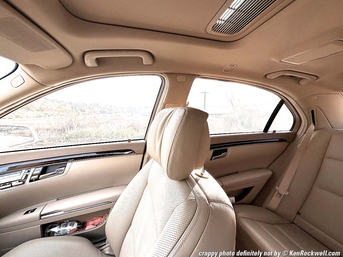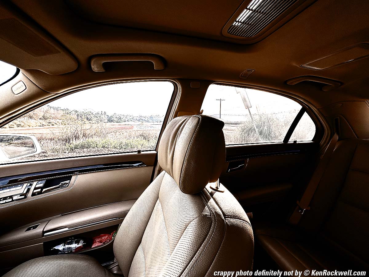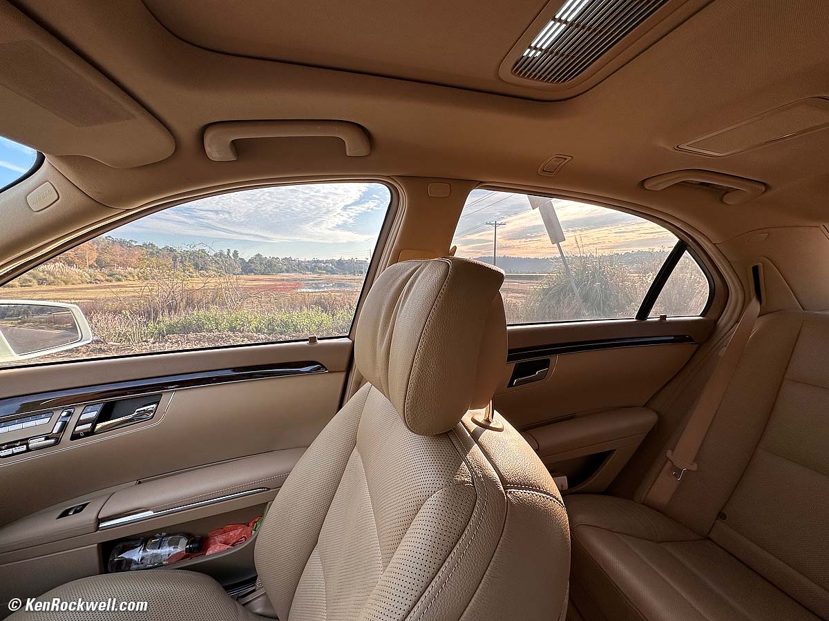 World's Best Light Meter performance topI get perfect exposure more often with iPhone than with any other camera, regardless of lighting conditions. Not only does it miraculously expose well in all sorts of difficult conditions., mine accurately meters down to starlight (LV -8⅔, or minus 8⅔), and possibly darker! What's crazy is that while under harsh lighting conditions where there is no one correct exposure because the dynamic range is so great that no single exposure will capture it all on a big camera, iPhone breaks the rules and just makes the picture look as the scene looked to our eyes with magic, automatic and clairvoyant HDR in one snap whenever it needs it. Bravo! Here's a grab shot inside a car exactly as it came out of iPhone. The brilliant morning light was streaming in and the car was dark inside, and iPhone caught it all exactly as it looked: Inside the S550, 8:27 A.M., Thursday 15 December 2022. Apple iPhone 14 Pro Max 0.5× (2.2mm actual or 13mm eq.) camera, f/2.2 at 1/348 at Auto ISO 40 (LV 12.0), exactly as shot. bigger. You don't need to do anything other than press the shutter button ( ⬤ ) to get these results, no fiddling required. Bravo! Of course I want this to look better than it did, so Perfectly Clear (Radiant Photo) software can throw more light and color on it for artistic effect: Same shot, made prettier than life with Perfectly Clear (Radiant Photo) software. bigger. Here's how the harsh light probably would look with single shots on a big camera: