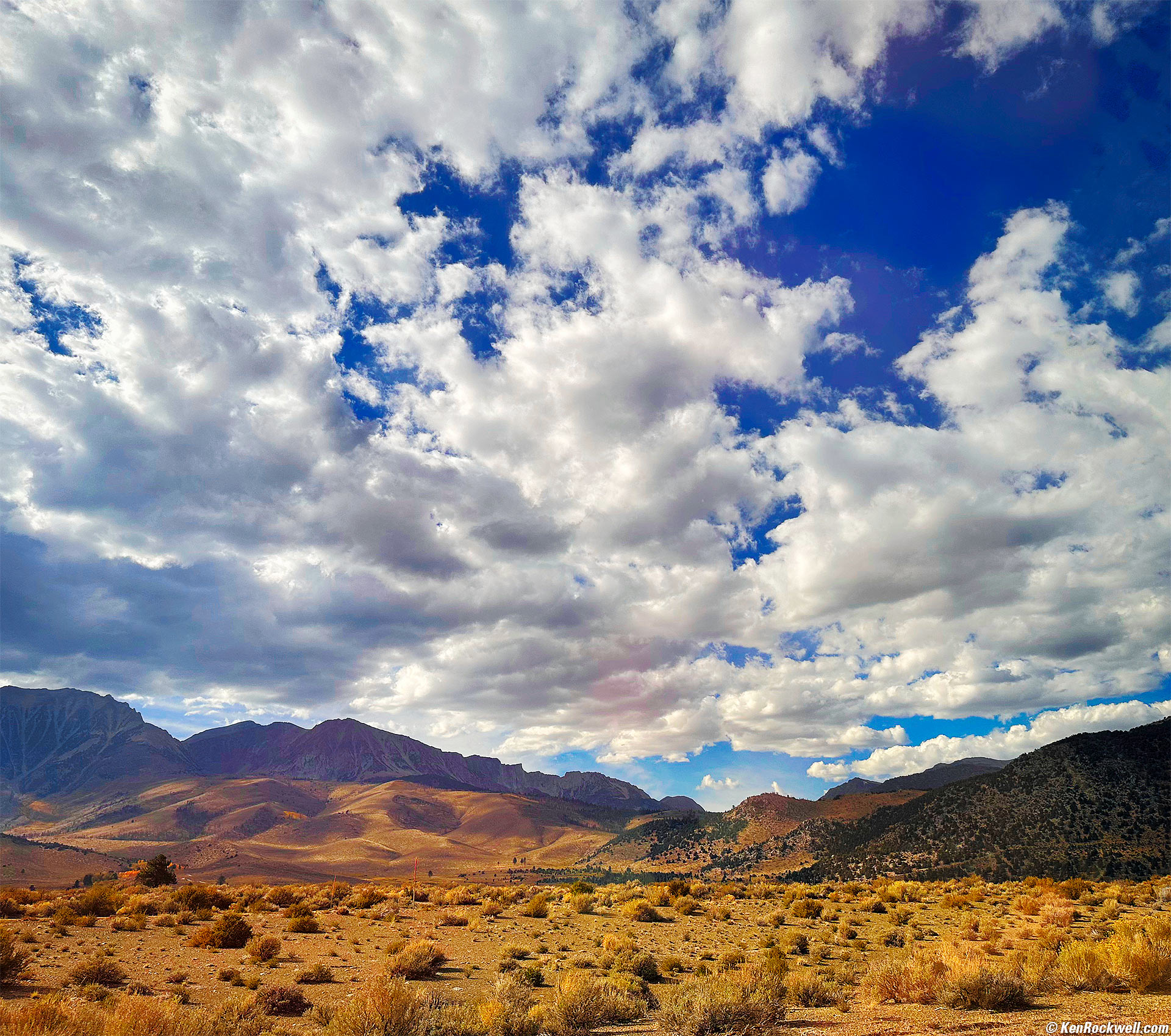 Sample Images topSample Images Intro New Good Bad Missing Specifications Accessories Performance Compared User's Guide Recommendations These are from my trips to Yosemite & California's Eastern Sierra in October 2022, at which you can read more about how I crafted each image. I'm an artist. Most of these received significant creative input after I shot them, often editing them in my iPhone itself. Here are more technical and artistic details about how I made these photos. You can see more of my work at my Gallery. All these photos were shot in just seven days: Clouds over June Lake, California as Seen from a Moving Car on US Route 395, California, 2:56 P.M., 17 October 2022. Apple iPhone 14 Pro Max 1× (6.9mm actual or 24mm eq.) camera, f/1.8 at 1/4,762 at Auto ISO 80 (LV14.2). More tech details. bigger or fit-to-screen.. A great thing always about iPhone is that it shoots wide-open even in daylight. It has and needs no lens diaphragm. Its short 6.9mm actual (24mm equivalent) focal length 1× standard camera has plenty of depth of field at f/1.8, and shooting at f/1.8 in daylight means that the 1/4,762 shutter speed stopped all the motion. The foreground would have been horribly motion-blurred if I had tried to jam my EOS R6 up to the windshield, and good luck to me trying to see the EOS R6's tiny dim LCD at arm's length in a moving car!