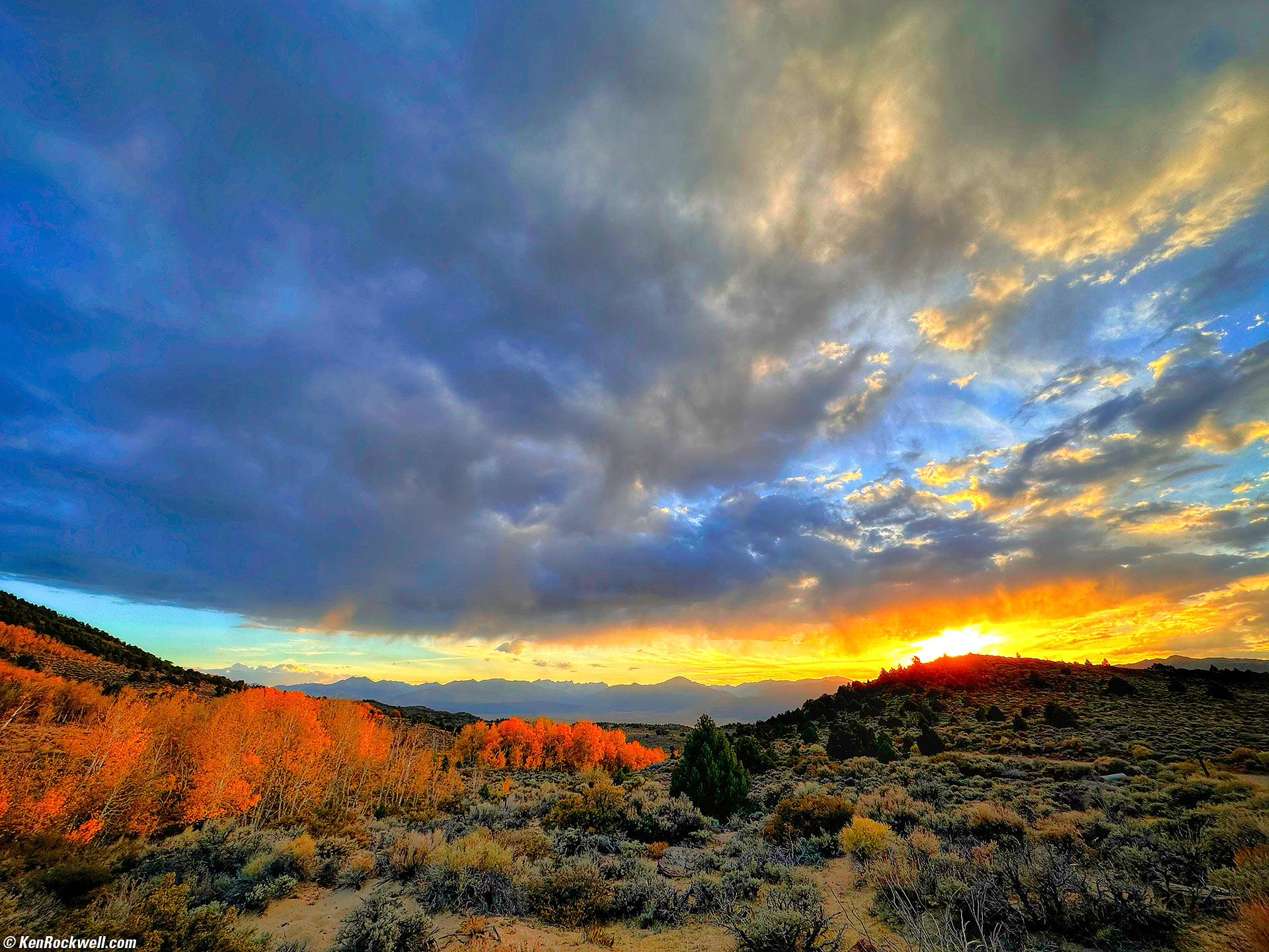 Sunset, East of Walker Lake, Bridgeport, California, 6:01 P.M.17 October 2022. Apple iPhone 14 Pro Max 0.5× (2.2mm actual or 13mm eq.) camera, f/2.2 at 1/369 at Auto ISO 40 (LV 12⅛). More tech details. bigger or fit-to-screen. I did most of the jacking of this image with the free Snapseed app on my iPhone at the scene, and then worked it some more in Skylum Luminar Neo. Try editing and sharing your images right from your Canon, Sony, Nikon, Fuji, LEICA or HASSELBLAD as we take for granted with iPhone!