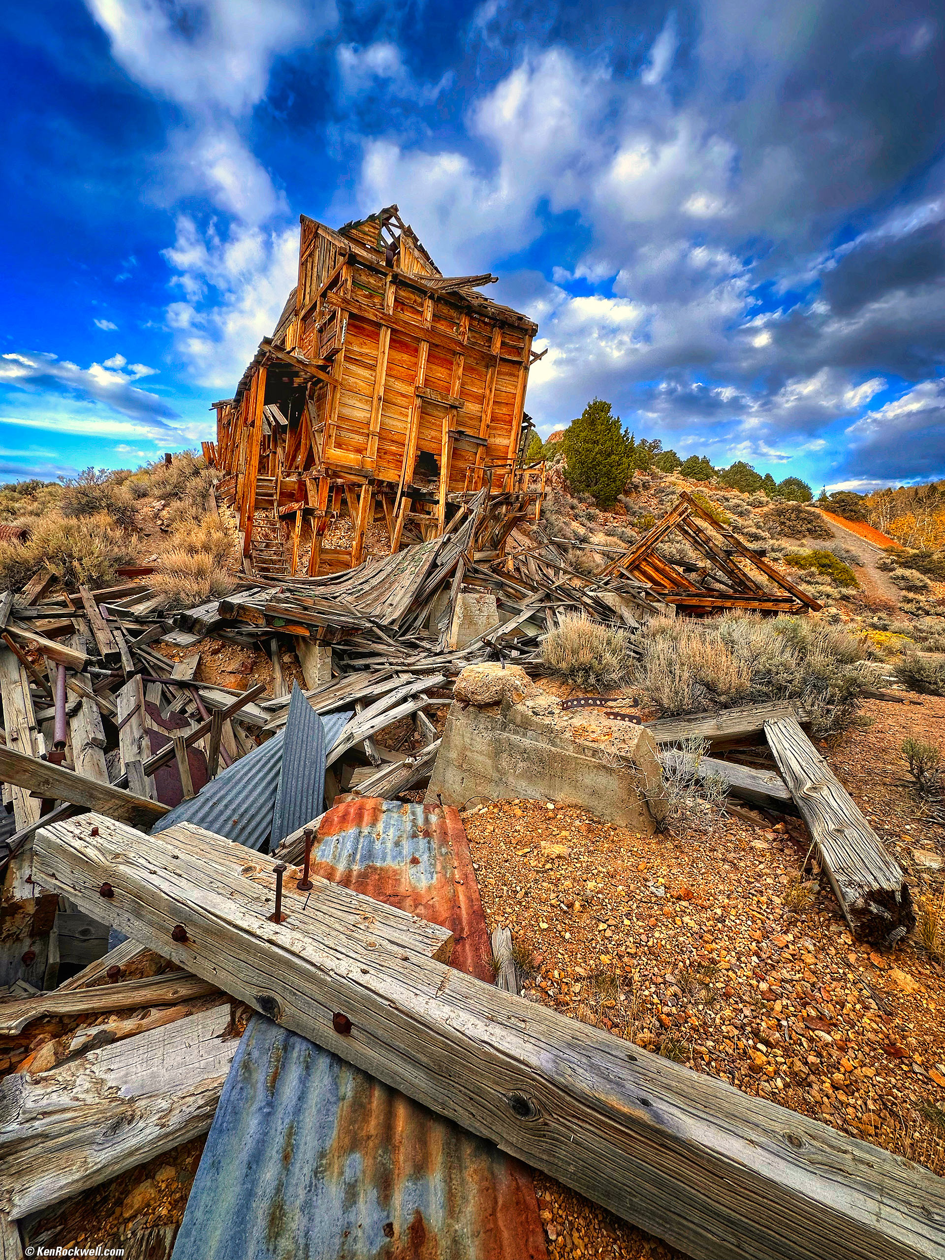 Abandoned Mine near Walker Lake, Bridgeport, California, 5:16 P.M., 17 October 2022. Apple iPhone 14 Pro Max 0.5× (2.2mm actual or 13mm eq.) camera at f/2.2 at 1/155 at Auto ISO 40 (LV 10.9). More tech details. bigger or fit-to-screen. I first worked this in the free Snapseed app on my iPhone while on location, and later used Skylum Luminar Neo to take it further. I love how my iPhone makes it trivial to jam it into any weird position and still be super-easy to compose on its huge, bright screen, especially with its ultra-ultra wide 0.5× (2.2mm actual or 13mm eq.) camera with which every millimeter of position changes the picture's composition. Also because of its super-short (2.2mm actual focal length) lens the iPhone's ultra-ultra wide 0.5× camera has almost limitless depth of field. No way was I going to crawl around in this mess with a big camera just inches off the ground and hope to keep it all in focus.