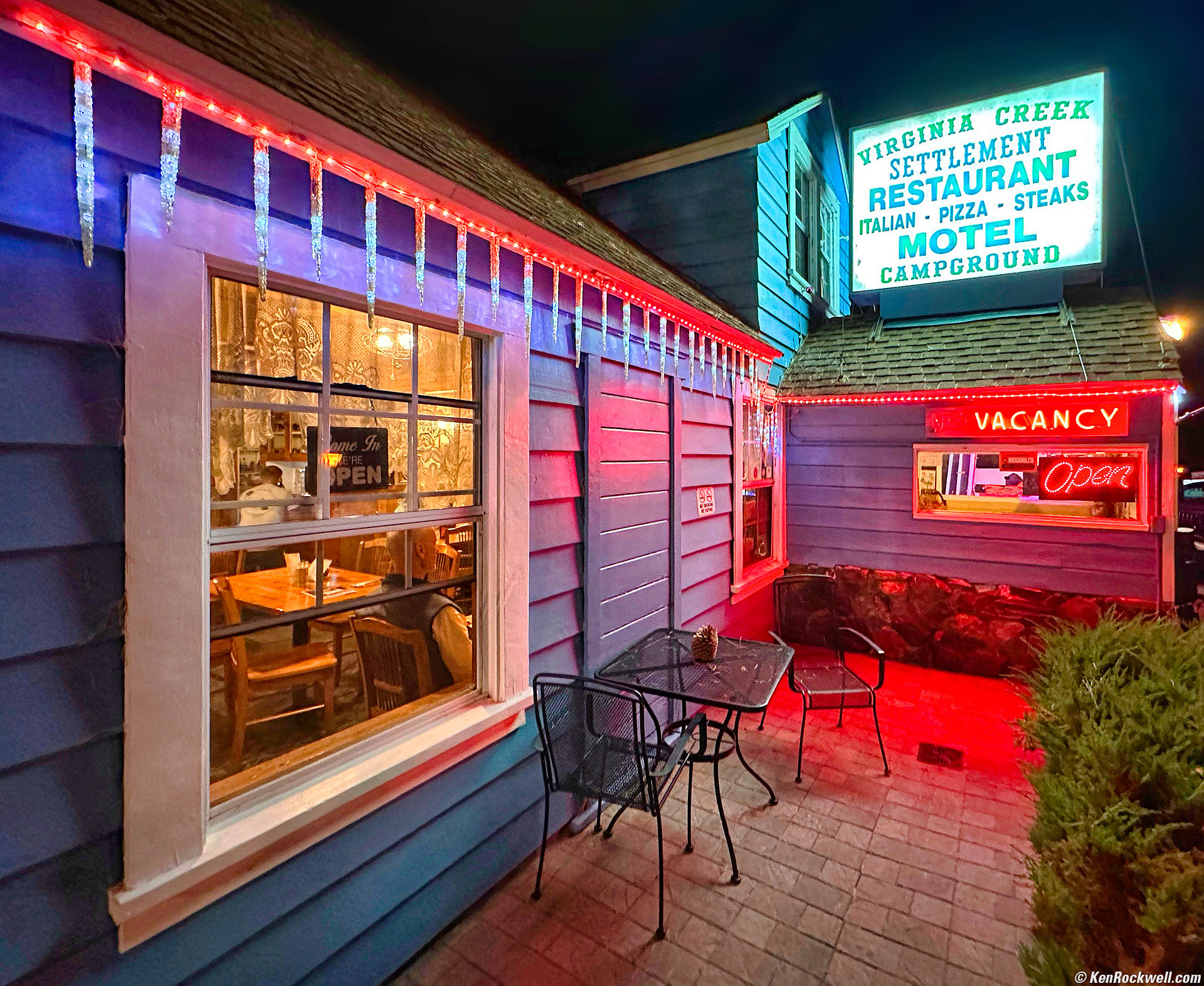 Virginia Creek Settlement Restaurant, Bridgeport, California, 7:19 P.M. 17 October 2022. Apple iPhone 14 Pro Max 0.5× (2.2mm actual or 13mm eq.) camera, f/2.2 at 1/40 at Auto ISO 1,250 (LV 4.0). More tech details. bigger or fit-to-screen. I fiddled with this with the free Snapseed app on my iPhone at the location and then more back in my studio in Skylum Luminar Neo.