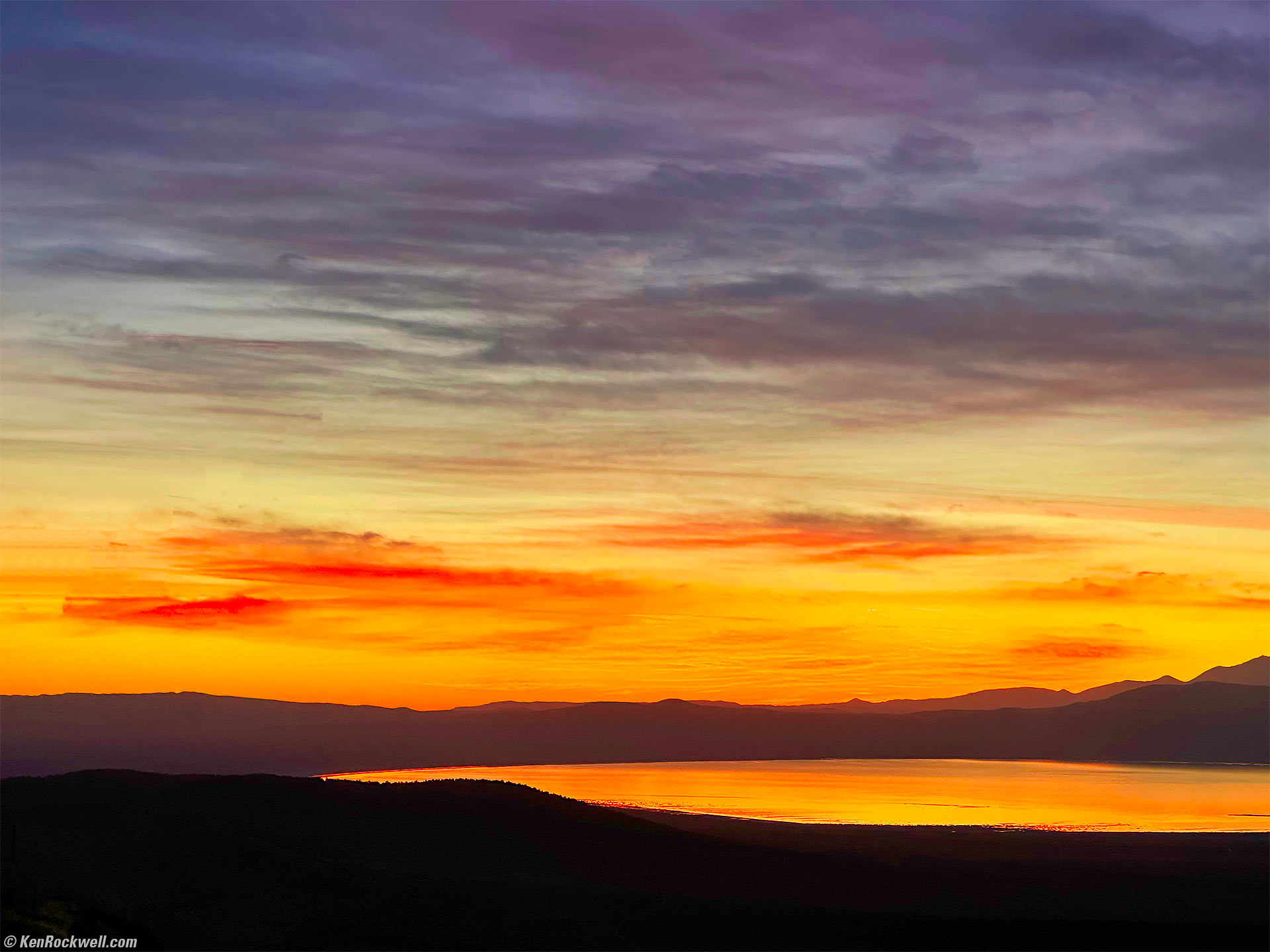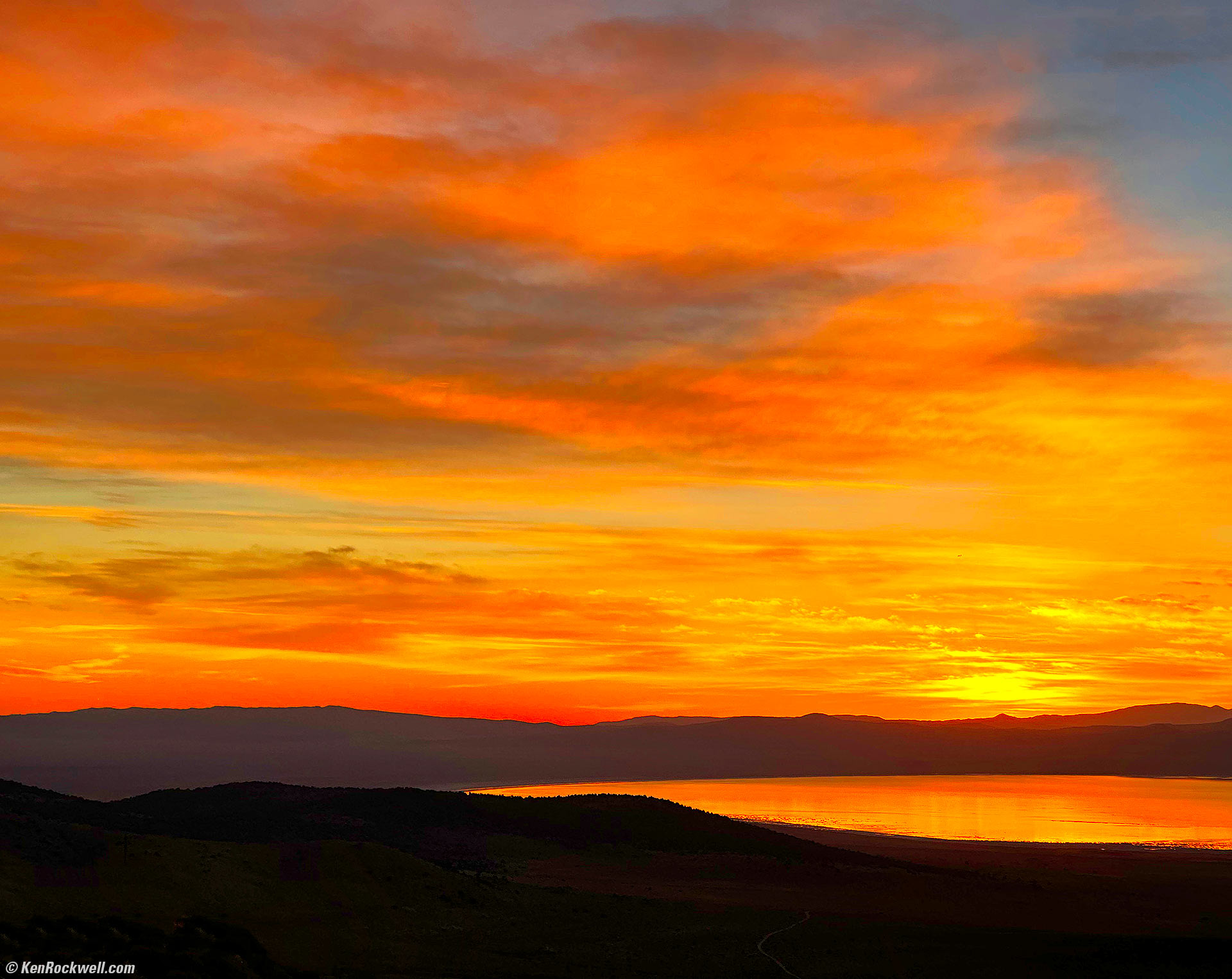 Sunrise over Mono Lake as Seen from Conway Summit, 7:05 A.M., 18 October 2022. Apple iPhone 14 Pro Max 3× (9mm actual or 77mm eq.) camera, f/2.8 at 1/247 at Auto ISO 32 (LV 12.6). More tech details. bigger or fit-to-screen. Yes, these are similar images, but they are also very different. My website, my rules.