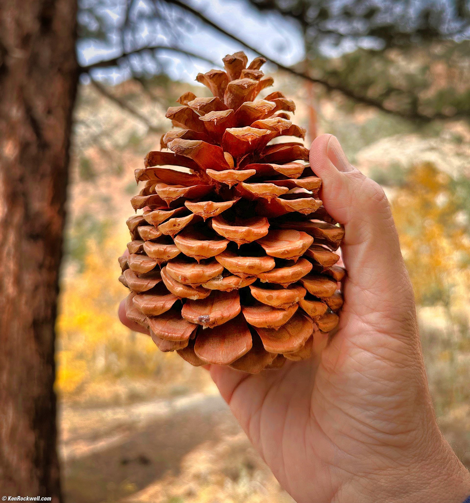 Pine Cone, Poole Power Plant Road, Mammoth Lakes, California, 12:24 P.M., 18 October 2022. Apple iPhone 14 Pro Max 1× (6.9mm actual or 24mm eq.) camera, f/1.8 at 1/1,495 at Auto ISO 80 (LV 12½). More tech details. bigger or fit-to-screen. With its larger 48 MP sensor the iPhone 14 Pro Max now also has a longer lens to retain a similar 24mm equivalent 1× angle of view. For the first time I often notice background optical defocus effects in regular shooting, as you can see here and at the dog closeup photos above and below. This defocus (bokeh) is what's coming from the lens; it's not an electronic portrait mode.