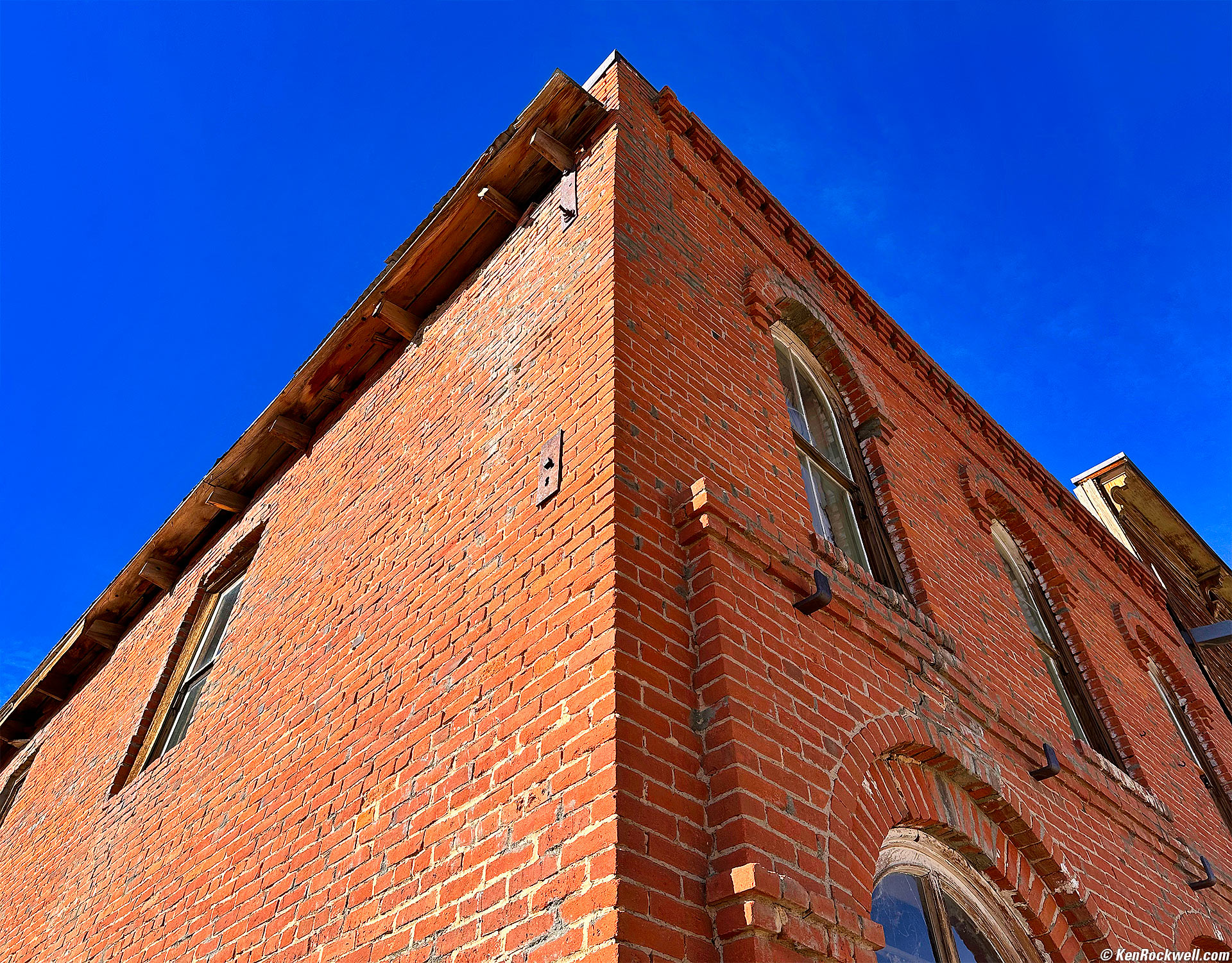 Brick Building, Bodie, California, 3:24 P.M., 18 October 2022. Apple iPhone 14 Pro Max 1× (6.9mm actual or 24mm eq.) camera, f/1.8 at 1/3,247 at Auto ISO 80 (LV 13⅔). More tech details. bigger or fit-to-screen.