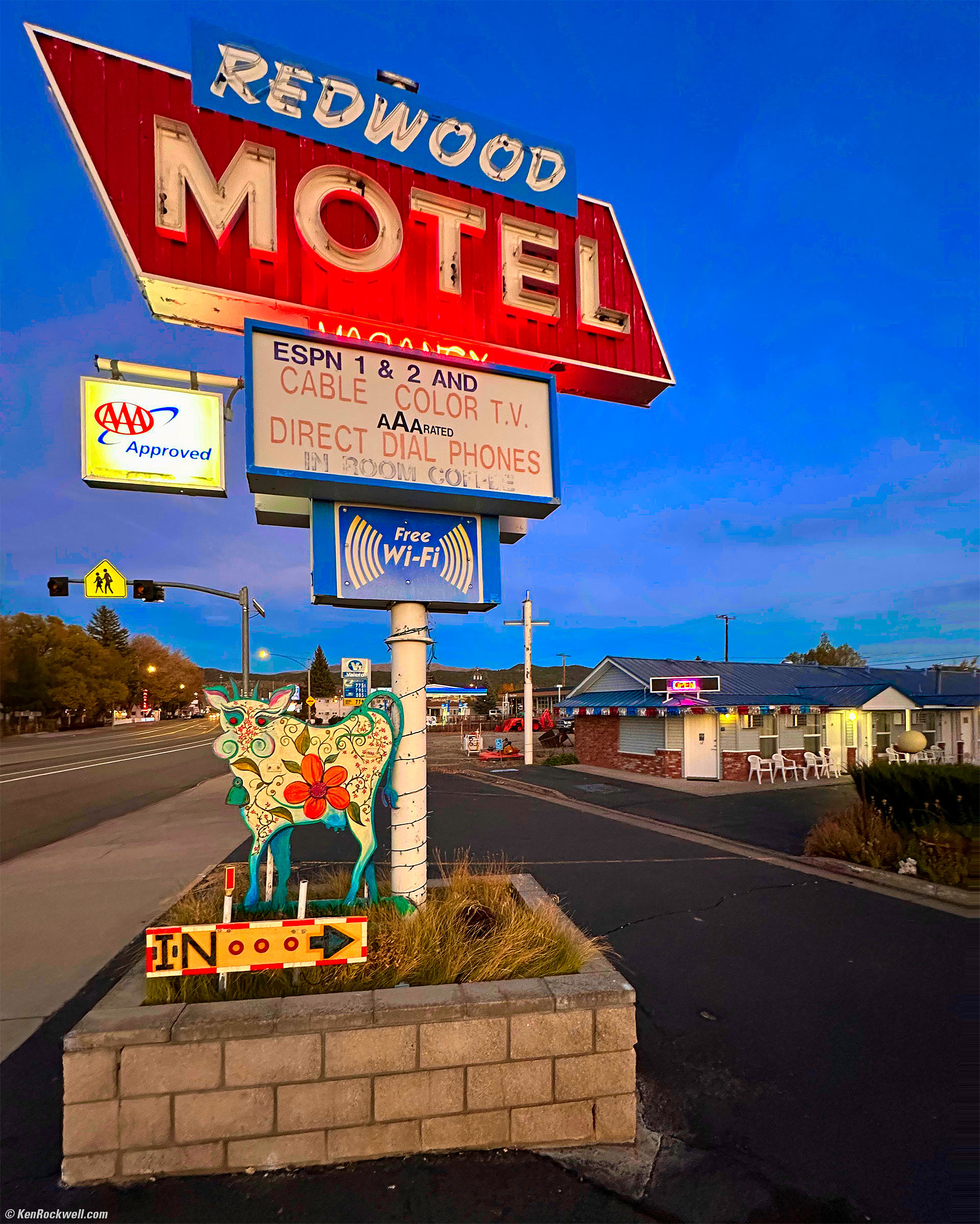 Redwood Motel, Bridgeport, California, 6:34 P.M. — when everything changed, 20 October 2019. Apple iPhone 14 Pro Max 0.5× (2.2mm actual or 13mm eq.) camera, f/2.2 at 1/60 at Auto ISO 800 (LV 5.2). More tech details. bigger or fit-to-screen.