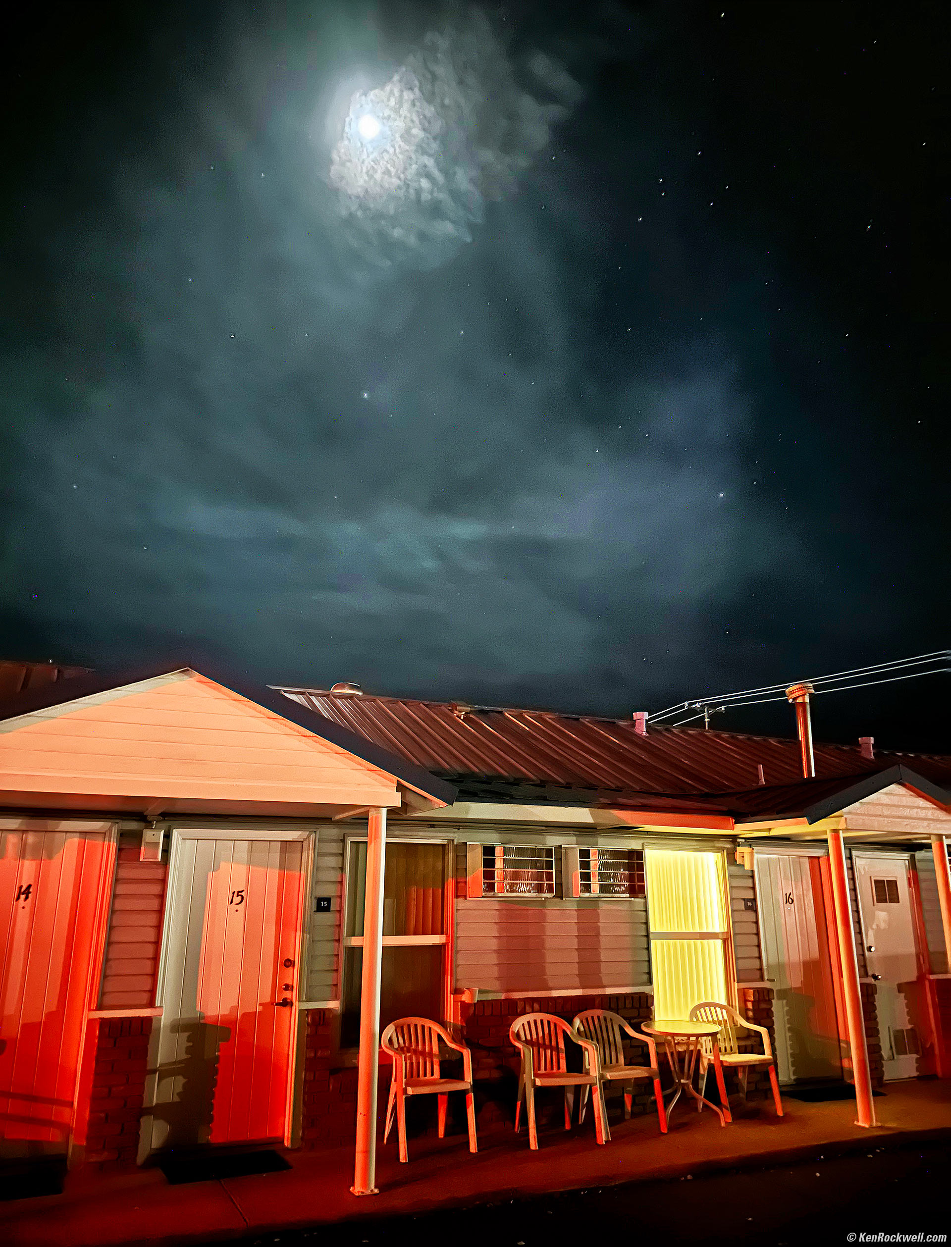 Moon and Stars over Redwood Motel Room 15, Bridgeport, California, 5:19 A.M., 19 October 2022. Apple iPhone 14 Pro Max 1× (6.9mm actual or 24mm eq.) camera, f/1.8 hand-held at 1/2 second at Auto ISO 8,000 (LV -3¾ IPS; that's LV minus 3¾!). More tech details. bigger or fit-to-screen. I went outside at 5:19 A.M. in the morning, looked up and saw the moon over our motel! I whipped out my iPhone and made a snap, and it looked exactly as this scene looked to my eyes! The iPhone 14 Pro Max is astonishing!!! While my iPhone caught this scene exactly as it looked to my eyes, it was very dark, with an inky black sky, hours before dawn. That's not how I want to show it, so I used the Perfectly Clear plug-in in Photoshop CS6 (2012) to lighten it up and make it much more exciting — exactly as I wanted it to look rather than how it actually looked. The red light on the foreground is from car taillights of others in our group who were ready to head out. Back in olden days I'd have needed a tripod to make a half-hour exposure at f/4.5 on Velvia 50 to get this same exposure (allowing for reciprocity failure), and even if I didn't have to set up a tripod I'd have missed the rest of the group because we all took off six minutes after this at 5:25 A.M. to catch the 7:10 A.M. sunrise down at Mono Lake's South Tufa. Even with a half-hour exposure at f/4.5 it would have been tough to get both the sky and motel in focus at the same time. The iPhone 14 Pro Max has much more depth of field due to its much shorter 6.9mm actual focal length lens. Velvia also would turn very green with a long exposure, and other films are similarly difficult. With my iPhone I can shoot things like this that simply couldn't be caught on film under real-world time constraints like this; this was a hand-held grab shot as we headed out.