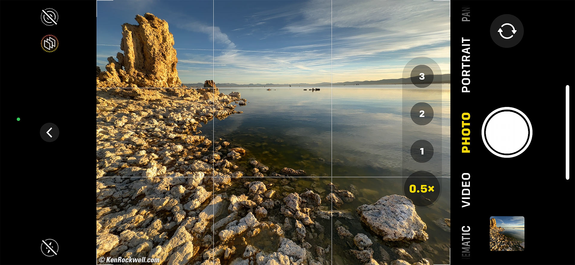 Sunrise, South Tufa, Mono Lake, California, 7:35 A.M., 19 October 2022. Apple iPhone 14 Pro Max 0.5× (2.2mm actual or 13mm eq.) camera, f/2.2 at 1/445 at Auto ISO 40 (LV 12.4). More tech details. bigger or fit-to-screen. While I had my EOS R6 and RF 15-30mm IS STM around my neck, I wasn't about to climb down on my belly on these rocks, and I certainly wasn't going to try to look at the R6's dinky screen compared how easy it is to drop my arm down with my iPhone, whose brilliant huge screen makes this all easy. I'm very close to the rocks; the ultra-ultrawide lens makes it seem like I'm much higher, but my iPhone is actually pretty far down in the rocks to bring the foreground much closer. Just for laughs here's how it looked on my iPhone 14 Pro Max screen as I shot it: Screenshot, Apple iPhone 14 Pro Max. bigger or fit-to-screen.