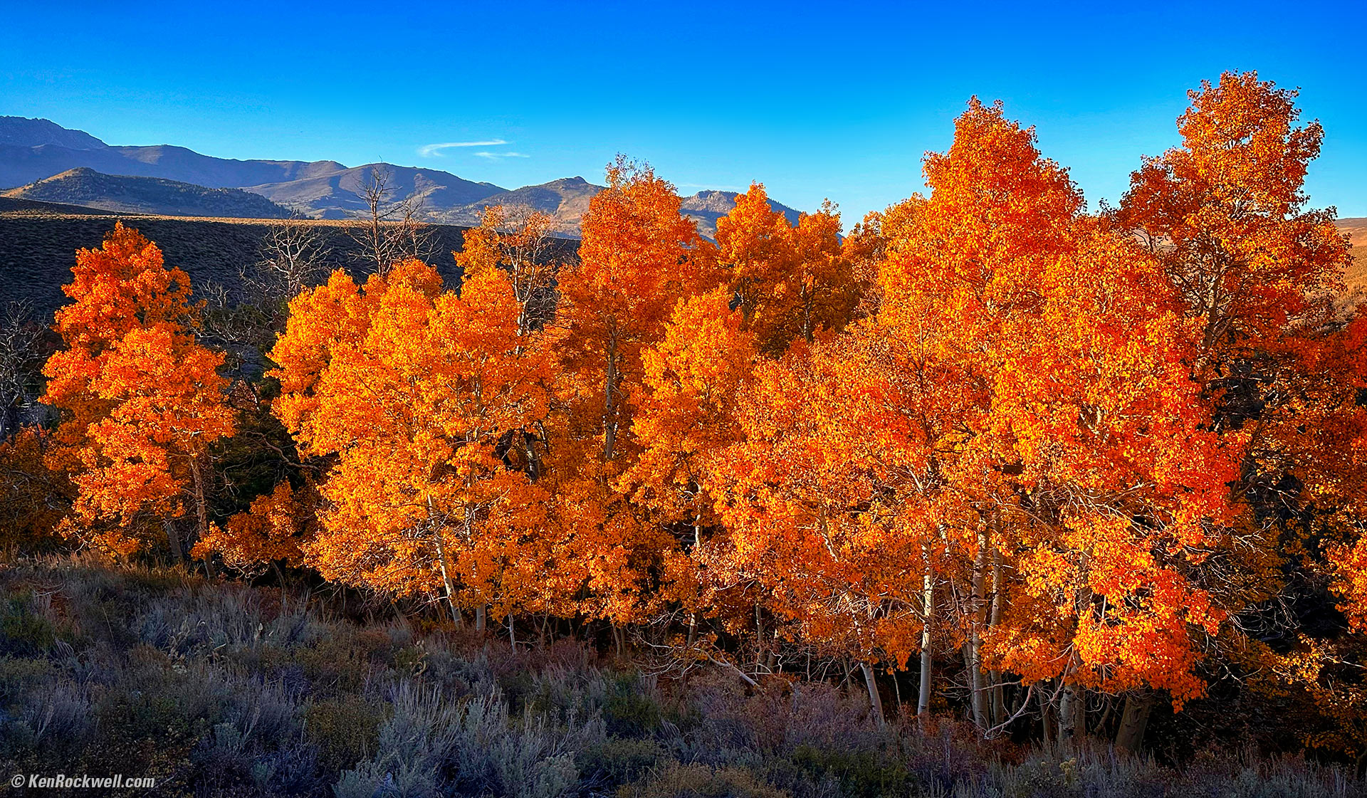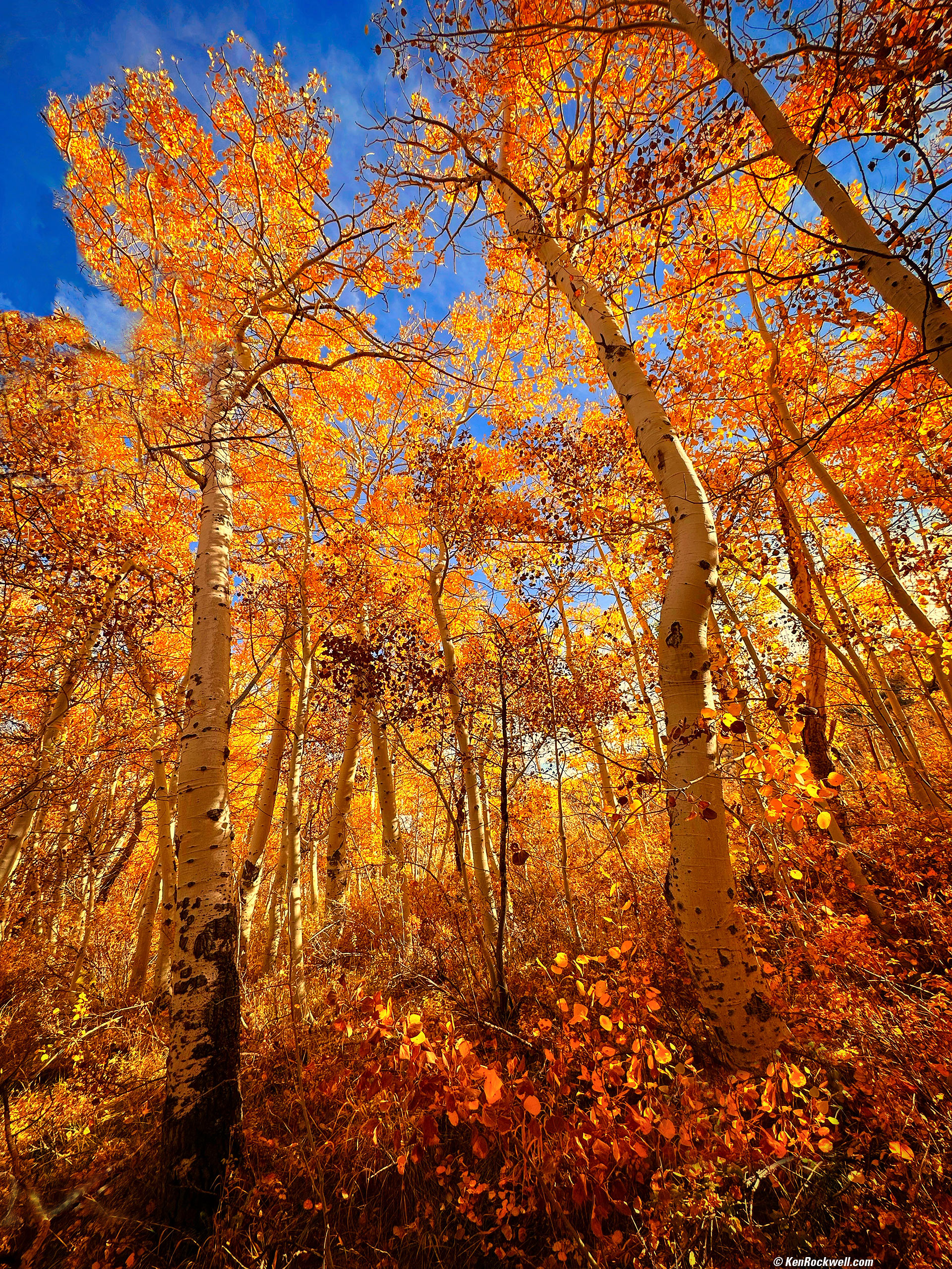 Dancing Inferno off Parker Lake Road, Mammoth Lakes, California, 9:52 A.M., 19 October 2022. Apple iPhone 14 Pro Max 0.5× (2.2mm actual or 13mm eq.) camera, f/2.2 at 1/972 at Auto ISO 50 (LV 13.2). More tech details. bigger or fit-to-screen. Much of the magic here comes from, in addition to paying rapt attention to composition, adding saturation and vignetting in the free Snapseed app on my iPhone while I was shooting and sending the images to friends back home.