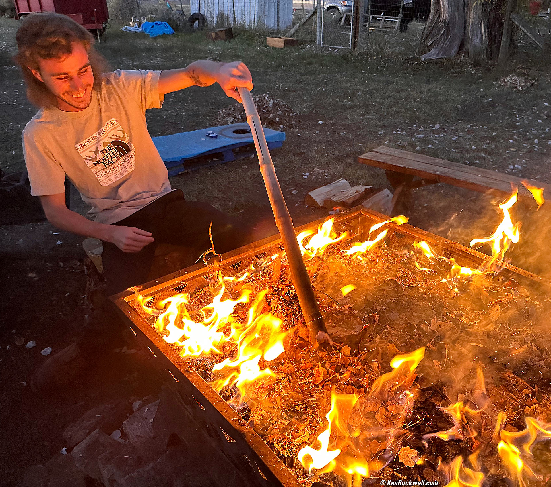 Will Works His Fire, Bridgeport, California, 6:32 P.M., 19 October 2022. Apple iPhone 14 Pro Max 1× (6.9mm actual or 24mm eq.) camera, f/1.8 at 1/60 at Auto ISO 640 (LV 4.9). More tech details. bigger or fit-to-screen. This is as shot, except for cropping and using Skylum Luminar Neo's Erase tool to remove some background distractions. iPhone easily handles this crazy lighting; point and shoot. Good luck with reportage futzing with a LEICA M's manual focus and center-weighted-only metering!
