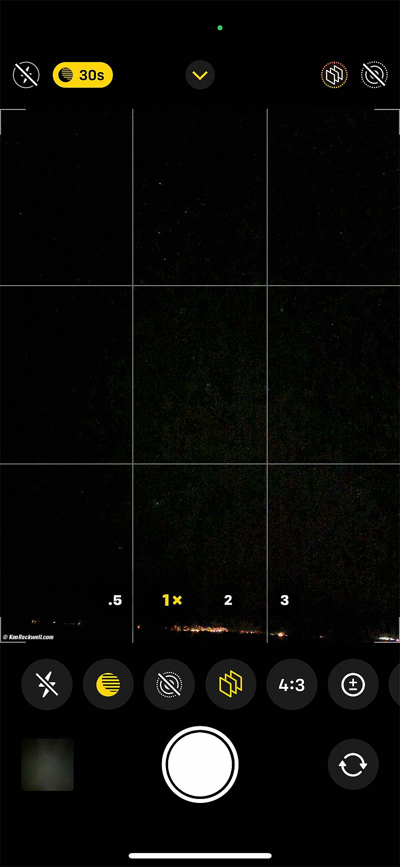 The Milky Way as seen from Twin Lakes Road, Bridgeport, California, 9:35 P.M., 19 October 2022. Apple iPhone 14 Pro Max 1× (6.9mm actual or 24mm eq.) camera, f/1.8 for 10 seconds (tripod) at Auto ISO 12,500 (LV -8.6, that's LV minus 8.6!). More tech details. bigger or fit-to-screen. To Shoot The Milky Way with an iPhone, I used my Oben CT-2491 Carbon-Fibre Tripod with my Manfrotto 410 (née Bogen 3275) Geared Head and Oben SPA-1000 iPhone adapter to hold it still, but it also works simply hand-holding it braced against something. By default iPhone will try to use flash, so turn that off by tapping the flash icon. Now that the flash is off, you'll see "☽ 3s" at the top (held vertically). For the cleanest image we want the longest exposure, so tap the little " ^ " symbol at the center top (held vertically) then along the bottom tap the ☽ moon (time exposure) icon and slide the time all the way to 30 seconds. Tap and release the ◉ shutter button, wait 30 seconds, and you've got your shot. If you hand-hold, the default exposure is about 2 seconds and the maximum time is about only 10 seconds. The iPhone knows from its acceleration sensors if it's on a tripod or not, and only allows times longer than 10 seconds if you're on a tripod. It's also brilliant in knowing that the longest any normal person will hold an iPhone for a long exposure is only a few seconds, and adjusts accordingly hand-held. Even though you'll get something even handheld for just a few seconds, longer exposures collect more light and result in more detail and less noise. While the indicated exposure times on the time exposure scale refer to the total time iPhone is exposing and counting down (like 30 seconds maximum in the shot above), the effective exposure time recorded in EXIF data is less (10 seconds in the shot above). This is because iPhone is using magic to capture and combine many, many separate shorter, sharper shots into the one file it saves. The Apple iPhone 14 Pro Max shot this as it looked to our eyes: dim. Most of this I edited in the free Snapseed app on my iPhone. Back at my studio I amped it even further in Skylum Luminar Neo. The actual Milky Way is very dim to our eyes, against a sea of stars. My iPhone caught enough invisible detail that I could pull it out later. Bravo! My newest Apple iPhone 14 Pro Max is vastly superior to my iPhone 11 Pro Max I used to make a similar shot back in 2019. My 2019 shot was astounding back in 2019 when I'd never seen a phone catch the Milky May before, but to be honest it was a very flat image that I forced into monochrome and then colorized to blue for effect — still a monochrome image, but oh the memories of that spot. Now the Apple iPhone 14 Pro Max sees in color under starlight - which is something even our eyes can't do. Here's something Nikon Z cameras can't do: Screen Shot: You can see the stars live! bigger. The finders of Nikon Z cameras, at least as of 2023, work very poorly in the dark. They become extremely noisy and nearly useless even in ordinary backyard nighttime light, while the iPhone is still amazingly clean and clear, showing us individual stars, even under starlight!