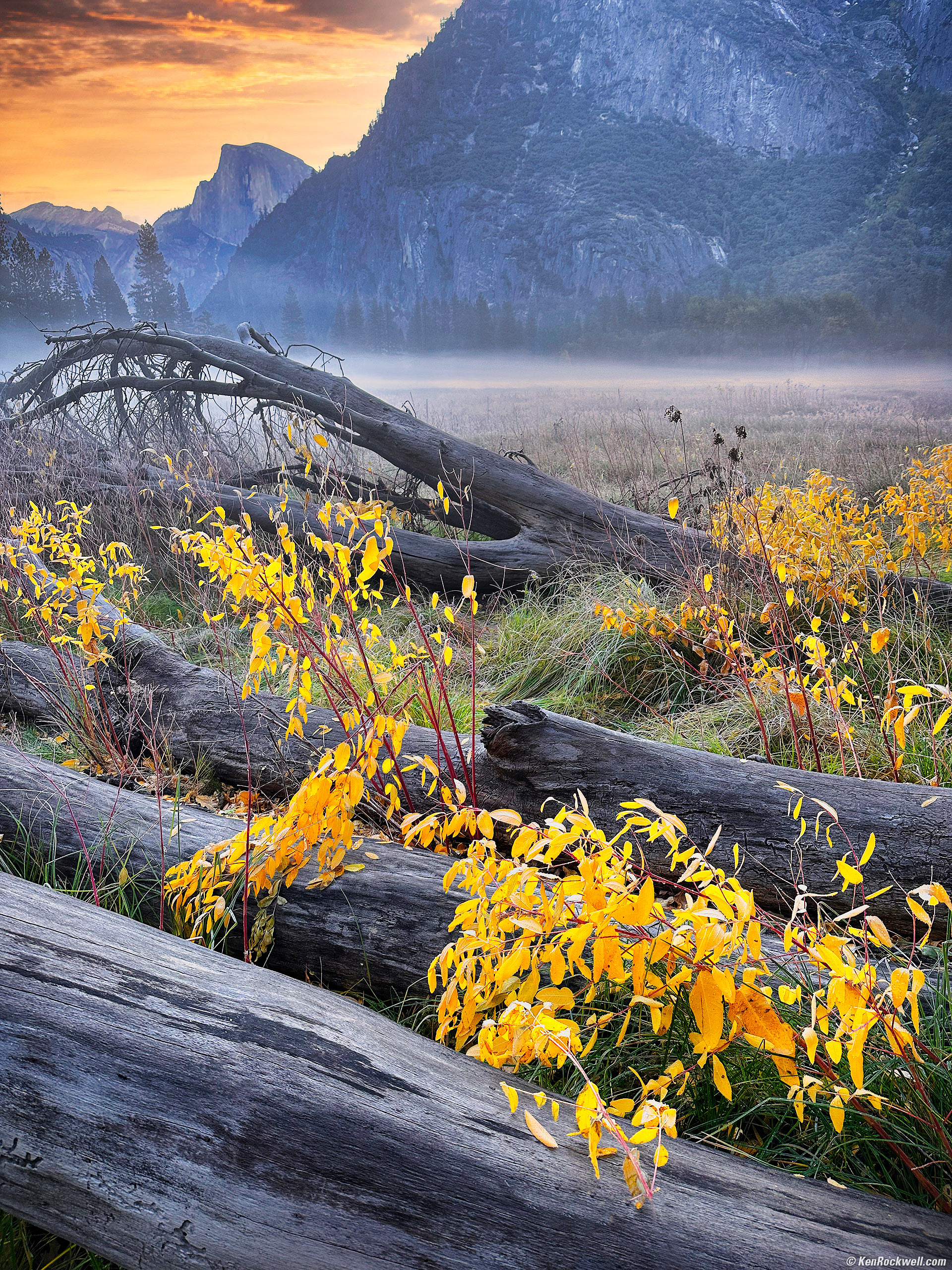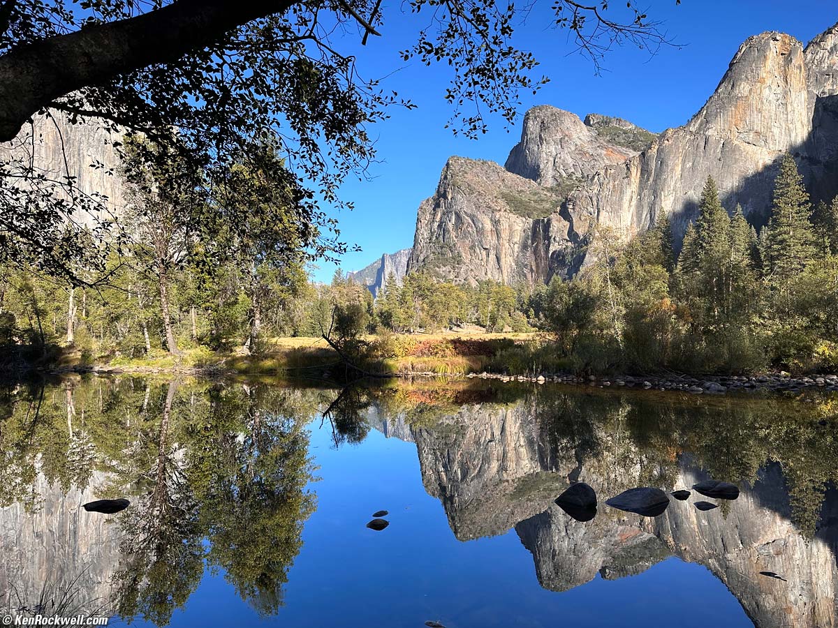 Yellow Dawn, Leidig Meadow at Sunrise, Yosemite National Park, California, 7:36 A.M., 23 October 2022. Apple iPhone 14 Pro Max 1× (6.9mm actual or 24mm eq.) camera, f/1.8 at 1/121 at Auto ISO 100 (LV 8.6). More tech details. bigger or fit-to-screen. I may have tried to hand-hold my Tiffen 0.9 gradiated neutral-density filter in front of my iPhone; I forget. I did use a grad filter on my EOS R6 and RF 15-30mm IS STM which needed it for this shot, but generally the iPhone weaves such magic with its always-active HDR that I doubt I did. I shot this with both my EOS R6 and RF 15-30mm IS STM and iPhone 14 Pro Max. I prefer this iPhone image because its aspect ratio is better for this subject and I just happened to find a better compositional location to hold my iPhone than I did with my R6. Everything about this shot (and most shots) is the composition of where each of the elements are placed in the image, which varies wildly with changes of just millimeters of position when you're as close as I was. Tripods never would have worked here; I don't have a 3D micro head to let me place the camera precisely in three dimensions as I can with my arm. I used Skylum Luminar Neo to add wow, especially adding punch to the yellow leaves and to adjust the shadows and highlights and add emphasis with vignetting. I also used Perfectly Clear since it helped as well with levels. There were no clouds and no detail in the sky, so I added a sky with Neo, which was trivially easy. Neo also made it easy to remove distracting leaves and twigs in the foreground. This is art; I'm not trying to copy nature. The scene as we came across it was pretty gray and boring, but I knew I could turn it into something cool.