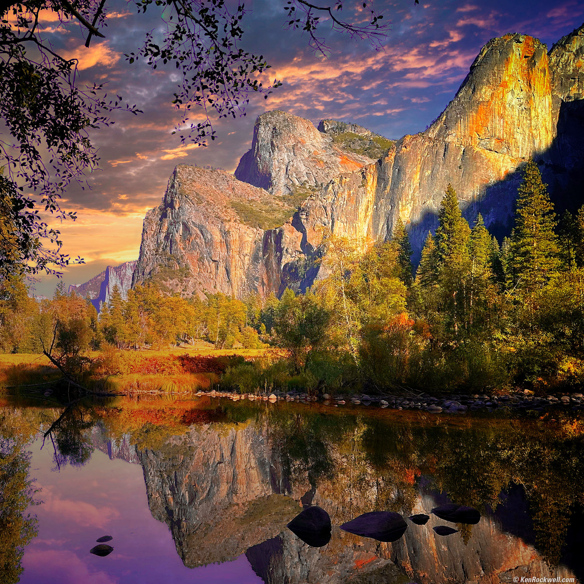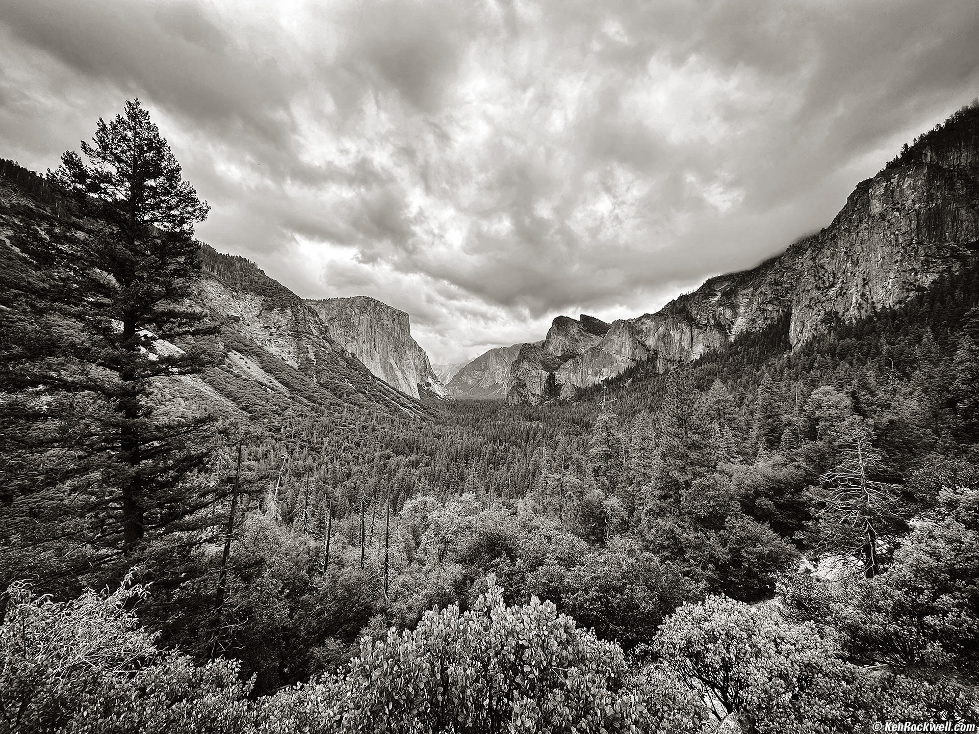 Valley View with Dramatic Sunset Clouds, Yosemite National Park, California, 4:16 P.M., 21 October 2022. Apple iPhone 14 Pro Max 1× (6.9mm actual or 24mm eq.) camera (equivalent to a little cropping from the ZEISS 50mm f/4 DISTAGON on HASSELBLAD 6×6), f/1.8 at 1/1,062 at Auto ISO 80 (LV 12.0). More tech details. bigger or fit-to-screen. I'm so bad. Artists know the only rule is that there are no rules. First I fiddled with this in the free Snapseed app in my iPhone right as I made the image. I amped it up, but the sky was blank. No problem; Skylum Luminar Neo made it trivially easy to add a sky. I added vignetting for emphasis and removed the boring left side and empty bottom and cropped it into a tighter square. Here's what came out of the iPhone, which is exactly as it looked to my eye — but not to my imagination: As shot. bigger. It's not just the crazy clouds and colors I added; cropping what's not needed both horizontally and vertically let what is important grow and make for a much stronger image. Laugh all you want, but artists have been adding skies to landscapes forever, and photographers have been adding clouds to photos since the 1800's using different optically-printed negatives on different masked sections of printing paper. This is nothing new; back in olden days plates and film were only sensitive to blue and ultraviolet light and it was nearly impossible to get a sky to appear in the same image as the foreground.