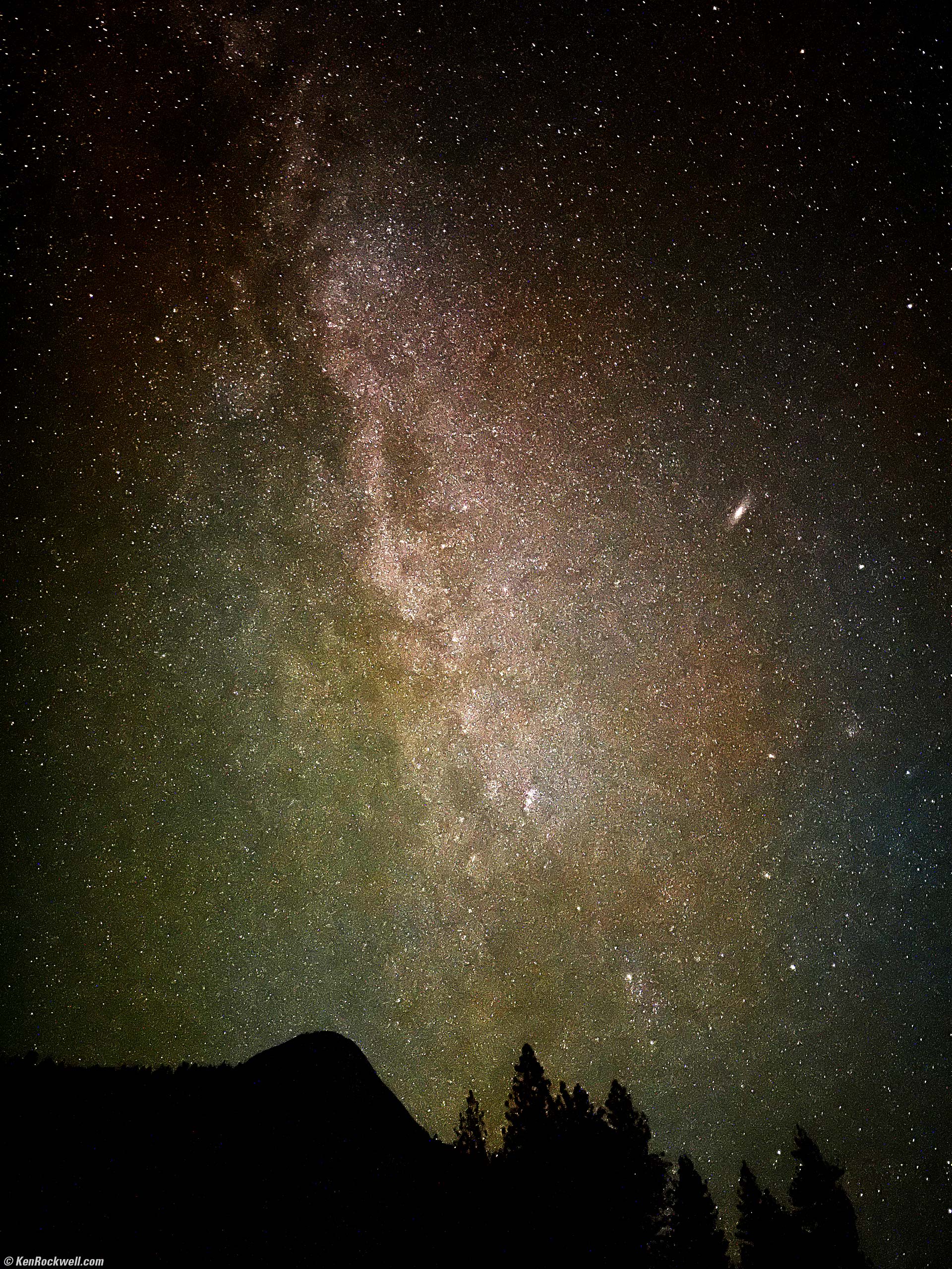 The Milky Way and the Andromeda Galaxy as seen from Stoneman Meadow, Yosemite National Park, California, 8:56 P.M., 21 October 2022. Apple iPhone 14 Pro Max 1× (6.9mm actual or 24mm eq.) camera, f/1.8 at 10 seconds (tripod) at Auto ISO 12,500 (LV -8⅔, or minus 8⅔. That's dark!). More tech details. bigger or fit-to-screen. The original iPhone image was rather dark and flat, sort of as it all looked to our eyes, so I used a simple curves adjustment layer to taste in Photoshop CS6 (2012). I was astonished that my iPhone is able to photograph the Andromeda Galaxy (the diagonal blob center right). I've never see a phone do that!
