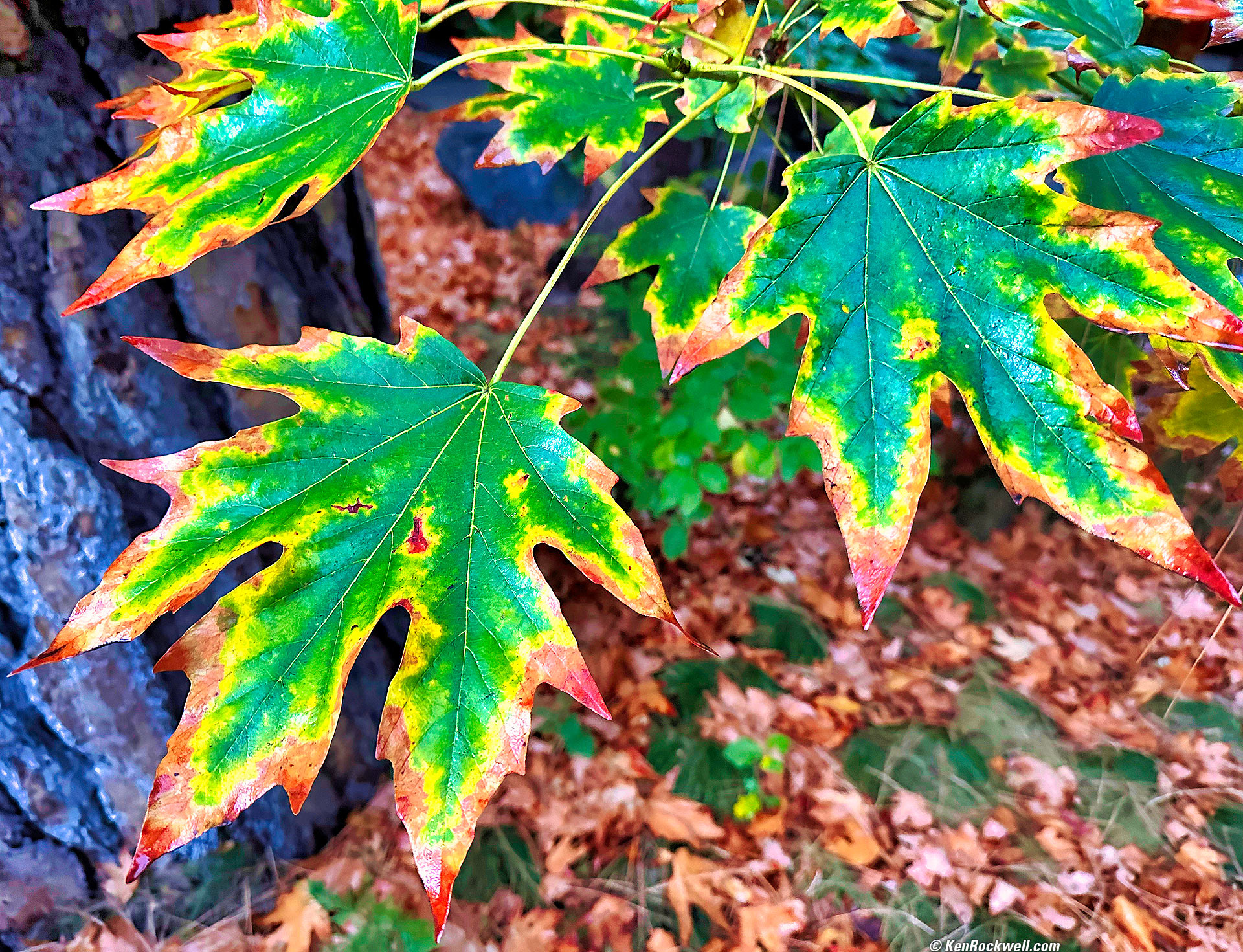 Maple Leaves, Yosemite Valley Lodge at the Falls, Yosemite National Park, California, 7:16 A.M., 23 October 2022. Apple iPhone 14 Pro Max 1× (6.9mm actual or 24mm eq.) camera, f/1.8 at 1/60 at Auto ISO 800 (LV 4.6). More tech details. bigger or fit-to-screen.
