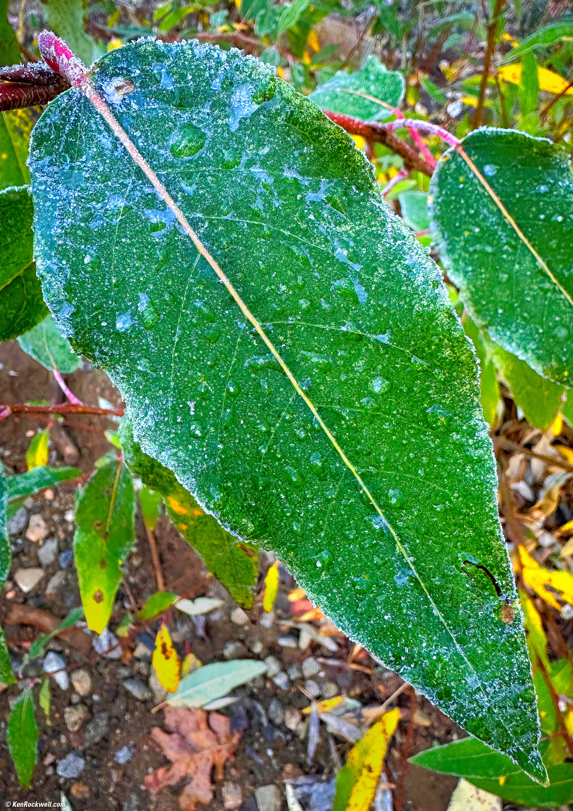 iPhone is great for closeups: Frosty Green Leaf by the Banks of the Merced River, Yosemite National Park, California, 8:58 A.M., 23 October 2022. Apple iPhone 14 Pro Max camera system at its 1× setting (which magically cropped to a full-frame equivalent of 24mm from the 0.5× camera with its 2.2mm lens because only it can focus this close), f/2.2 at 1/99 at Auto ISO 200 (LV 7.9). More tech details. bigger or fit-to-screen. The iPhone 14 Pro Max has essentially boundless macro ability. Just hold it up to anything, select your zoom level, and it just shoots regardless of how close you are. Bravo! I remember when lenses had "macro" ranges where you had to move slider switches just to swap to the macro mode. That was a pain!! The iPhone plays tricks in the background to make the magic happen so we don't need to move any switches. Due to the physics of optics, shorter lenses focus much, much closer than longer lenses. No worries, even if you're set at 1×, 2× or 3× or longer and get closer than about 7"/18cm (the close-focus limit of the 1× and 2× cameras, or about 2'/80cm for the 3× camera), then the iPhone silently swaps to the 0.5× camera that can focus ultra-close (or swaps to the 1× camera for the 3× setting between about 2' to 7" or 80 to 18 cm) and crops the image to the zoom level you've chosen, and then interpolates (upsamples) it to the usual 12 MP (4,032 × 3,024 pixels) image size, and no one except some of us notice. Upsampling from what was actually only a quarter of the pixels of the 0.5× camera (3 MP), the iPhone uses some brilliant tricks, like what looks like vectorizing the edges, so in this case we lose no sharpness on the edges of all the ice crystals. Its algorithms are doing a bang-up job vectorizing what it can so straight lines and edges stay ultra sharp, which works great on the frosty crystals here. The only way we really know what camera was used is when we see the actual optical focal length listed in Photo Mechanic or under Photos (tap the ⓘ photo info icon). In other words, Apple figured all this out for us and just does it, giving use an ultra-close image that's super sharp, all snapped while wearing gloves in the freezing dawn. If you want to keep the full 48 MP resolution of the 1× camera, you can have your iPhone warn you that it's cropping from the 0.5× camera if you set SETTINGS > CAMERA > MACRO CONTROL > ON, in which it will show a yellow circle with a flower in it to let you know it's cropping from the 0.5× camera. It doesn't show when it crops from the 1× camera when you're too close in the 3× mode because the 1× camera has 48 MP so you're not really losing anything cropping from it to make 3×. I worked this in Skylum Luminar Neo to emphasize the leaf. All the paragraphs above were covering what the iPhone does in the background all by itself.