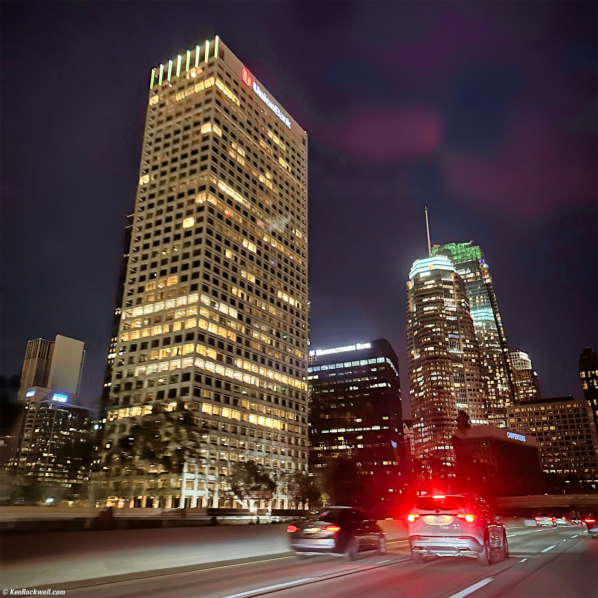 Downtown Los Angeles as Seen through the Tinted Windshield of a Moving Car on an Open Freeway, I-5 South Just past West 4th Street, 8:13 P.M., 23 October 2022. Apple iPhone 14 Pro Max 1× (6.9mm actual or 24mm eq.) camera, f/1.8 hand-held at 1/17 at Auto ISO 1,600 (LV 1.8). More tech details. bigger or fit-to-screen. I'm absolutely astounded by my iPhone. No matter how difficult or foolish are my attempts to shoot things that were previously unphotographable, like this hand-held shot out of a tinted moving car window at night on the freeway, my iPhone just gets the shot. Heck, most of our photos of things that held still with the first DSLRs 20 years ago were barely this sharp most of the time! Not bad for seven days of shooting. More technical and artistic details about how I made these photos. See also Photographs from Yosemite & California's Eastern Sierra, October 2022 for more about how I made each photo.