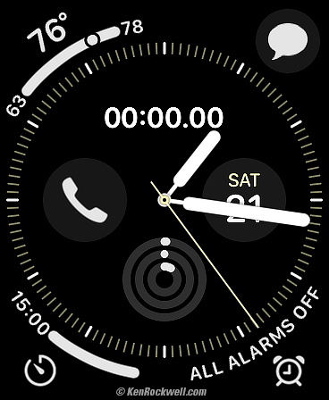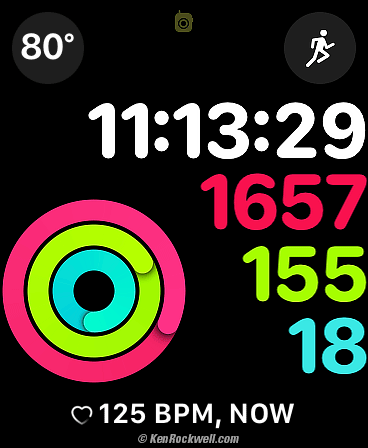 Apple Watch Series 5, 44mm, with an Italian Leather Loop Band. bigger. This particular watch face is called "Modular Compact." Each item in all of the many spots on the face are programmable. In this typical face, I've set it to show at glance: 1.) Day and Date. Tap to go to your calendar of events. 2.) Current temperature, as well as today's predicted high and low, and where the current temperature sits in this range. Tap this for the full weather reports for numerous cities. 3.) Beautiful and legible smooth-running hands to show hour, minute and seconds. 4.) Activity tracking showing calories burned, minutes of exercise and clock hours during which I've stood up. Tap for explicit details.