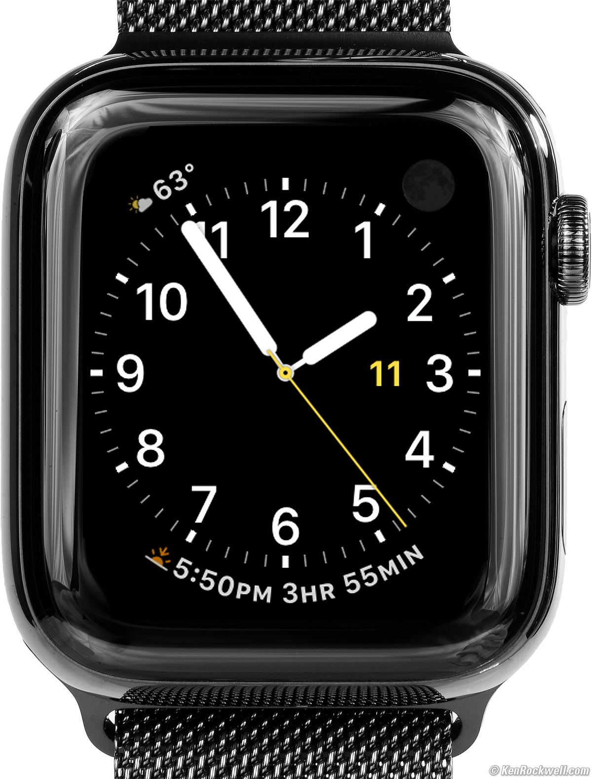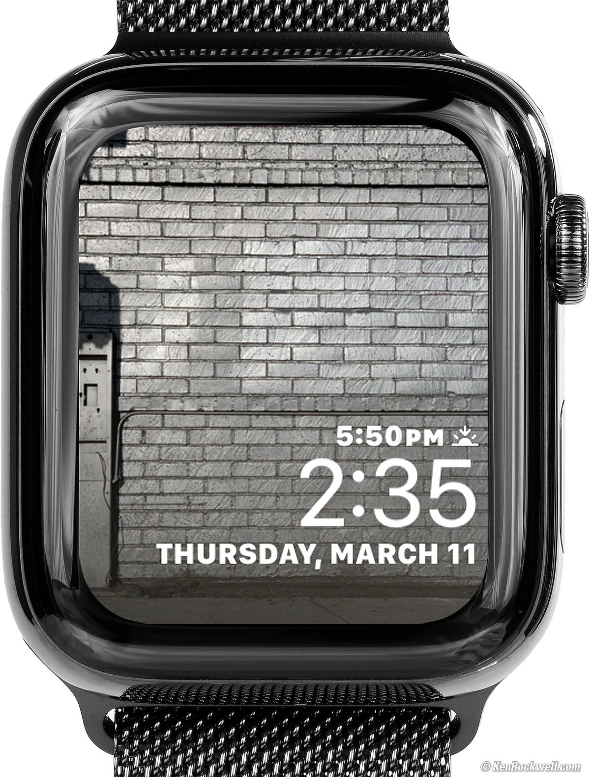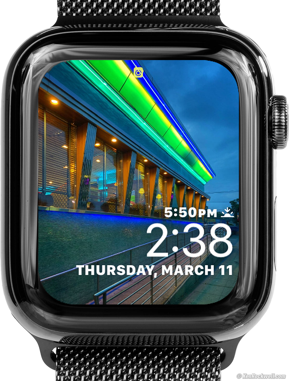 Sample Watch Faces topFaces Specs Compared User's Guide I'd get my Apple Watch Series 6 at B&H, at Adorama or at Amazon. Here are some of the faces I use. There are many, many more you can set and customize. All I do is swipe left or right to swap among these and many more: Infograph face can display just about anything. bigger. This particular watch face is called Infograph. Each item in all of the many spots on the face are programmable. In this typical face, I've set it to show at glance: 1.) Beautiful and legible smooth-running hands to show hour, minute and seconds. 2.) Current temperature, as well as today's predicted high and low, and where the current temperature sits in this range. Tap this for the full weather reports for numerous cities. 3.) Stopwatch. Tap to go to its screen for start/stop and analog/digital display options. Reads to 0.01 seconds and reads to thousands of hours. 4.) My next appointment or event shows along the top. Tap to go to Calendar of events. 5.) Wind speed and direction. Tap this for the full weather reports for numerous cities. 6.) Day and Date. Tap to go to Calendar of events. 7.) Telephone. Tap to go to the phone. 8.) Battery charge state. Tap to go to the details. 9.) Countdown timer. Tap to start/stop and set the duration. 10.) Alarms. Tap to go to them.