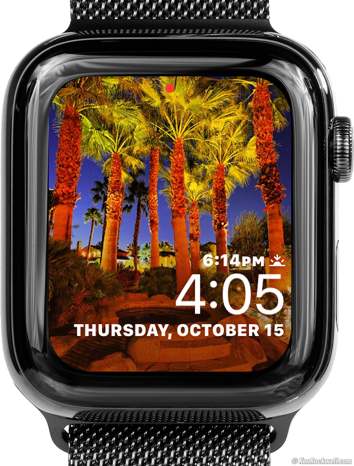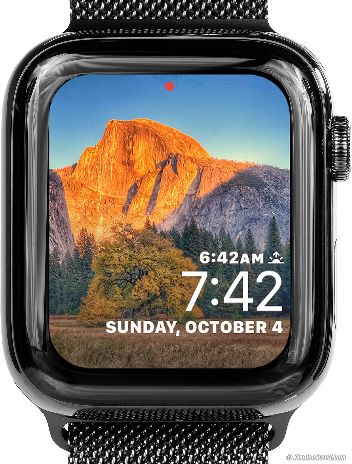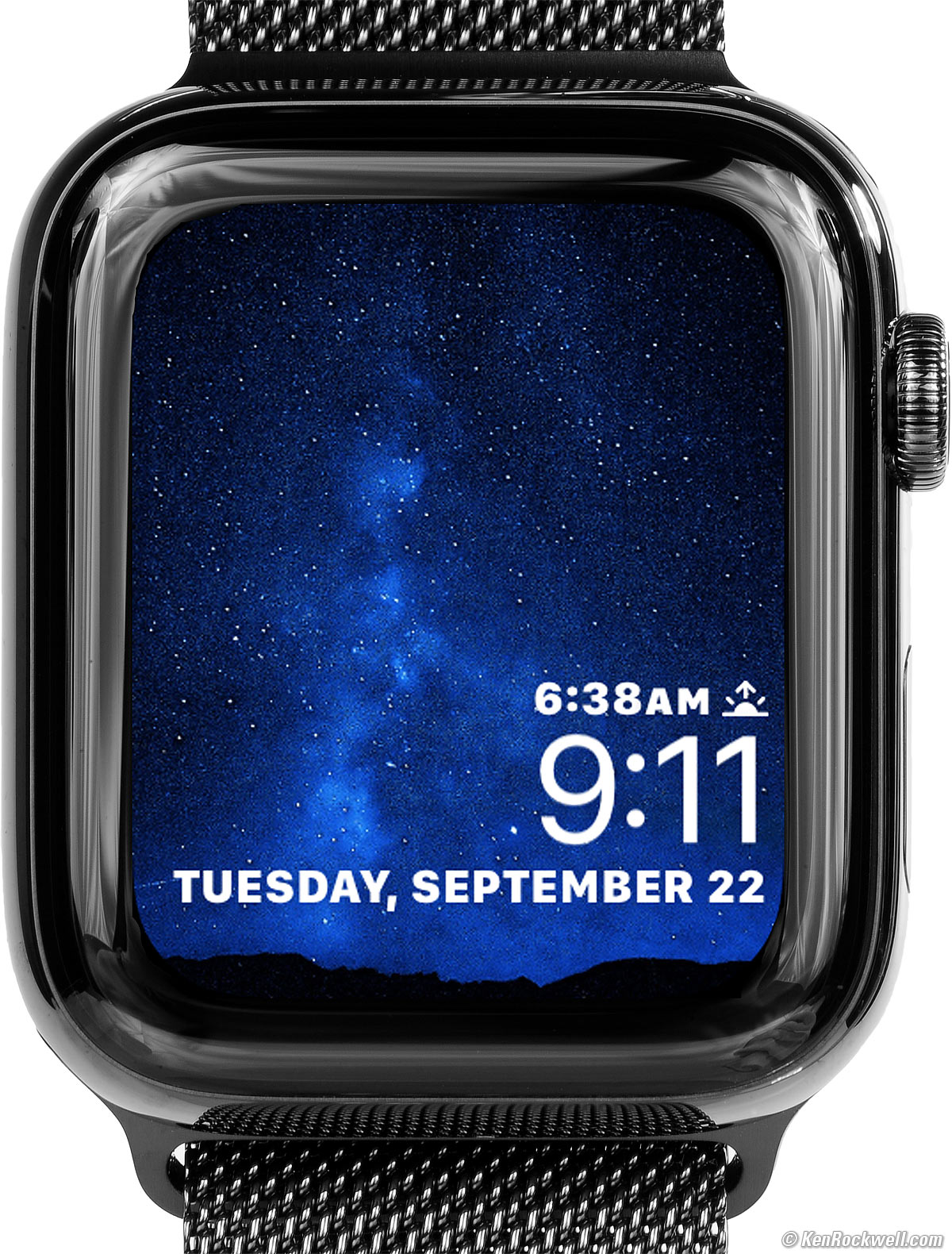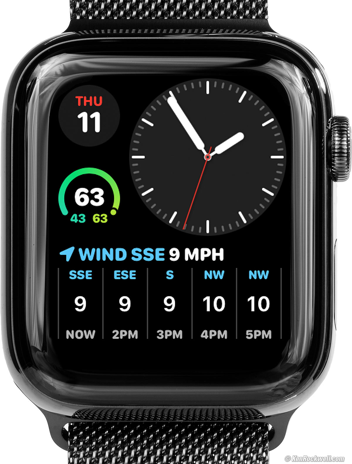 Sample Watch Faces topFaces Specs Compared User's Guide I'd get my Apple Watch Series 6 at B&H, at Adorama or at Amazon. Here are some of the faces I use. There are many, many more you can set and customize. All I do is swipe left or right to swap among these and many more: Infograph face can display just about anything. bigger. This particular watch face is called Infograph. Each item in all of the many spots on the face are programmable. In this typical face, I've set it to show at glance: 1.) Beautiful and legible smooth-running hands to show hour, minute and seconds. 2.) Current temperature, as well as today's predicted high and low, and where the current temperature sits in this range. Tap this for the full weather reports for numerous cities. 3.) Stopwatch. Tap to go to its screen for start/stop and analog/digital display options. Reads to 0.01 seconds and reads to thousands of hours. 4.) My next appointment or event shows along the top. Tap to go to Calendar of events. 5.) Wind speed and direction. Tap this for the full weather reports for numerous cities. 6.) Day and Date. Tap to go to Calendar of events. 7.) Telephone. Tap to go to the phone. 8.) Battery charge state. Tap to go to the details. 9.) Countdown timer. Tap to start/stop and set the duration. 10.) Alarms. Tap to go to them.