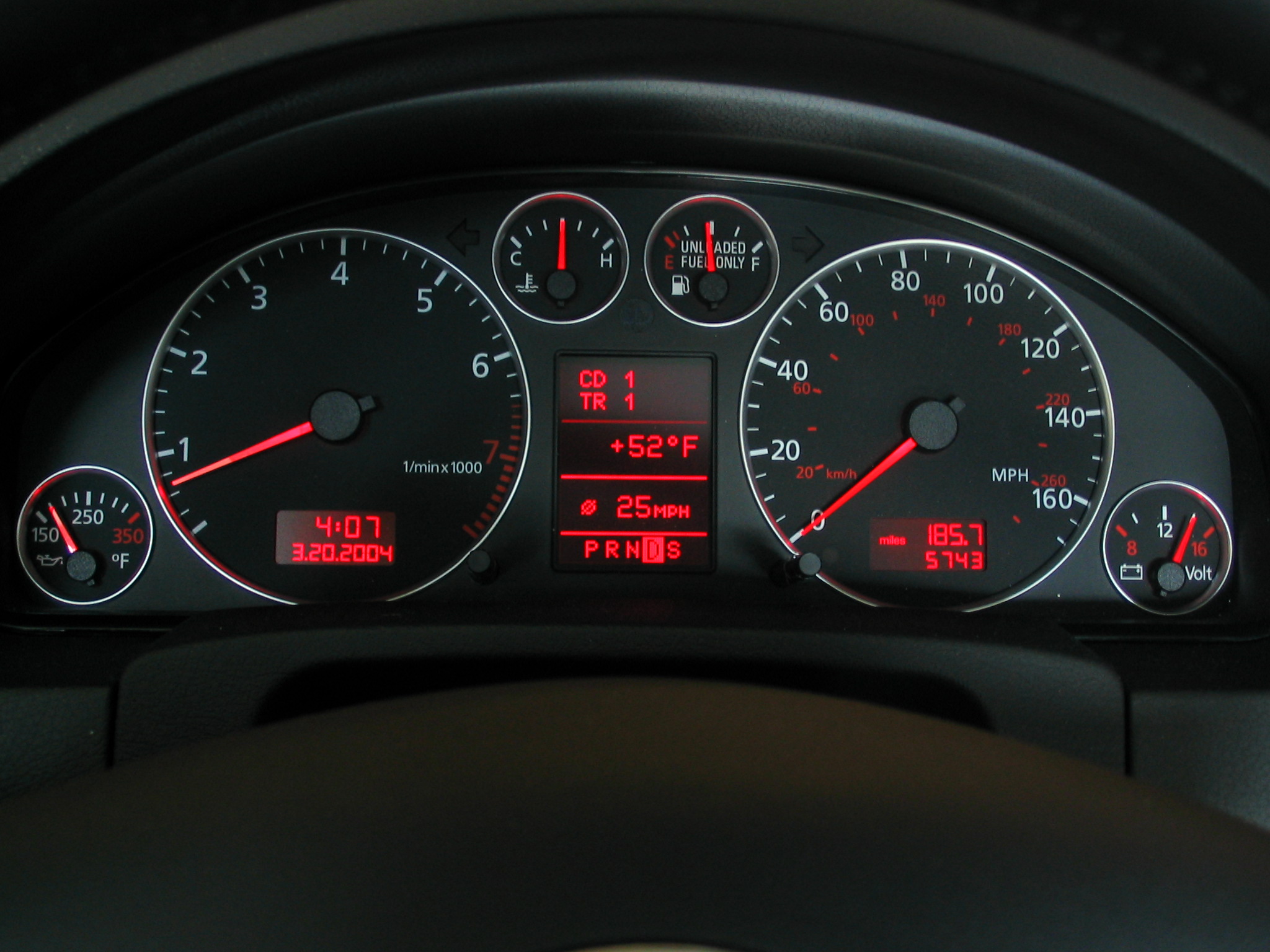 it for $34,000 on October 20th, 2004 see Audi's site here for details This is my dad's brand-new Audi. It was his pride and joy and has less than 6,000 miles on it. He bought it in June 2003 and still has the original German air in the tires. This Audi is so advanced that service is not due till each year is up or 10,000 miles, and it's all paid for in advance, too. Dad's been a car fanatic since he was a kid. He always got better and better cars, and as an engineer always appreciated all the care that was lavished on the better cars and treated them as well as he treated us. In the past dad always kept his new cars in perfect condition for many years. He always had a list of friends and coworkers who waited for him to get a new car so they could buy his previous one. Cars like this never make it to the classifieds. Since this is still new none of our usual friends so far can afford it! We're still asking around. It has 5,743 miles on it (5,774 as of May 18, 2004) and it's always garaged. We have all the original paperwork and window stickers. The first service for this advanced vehicle isn't due till 10,000 miles or June 2004. You can see Audi's site here for details on the almost identical 2004 model. The car is garaged on Long Island, New York. I could be tempted to deliver it anywhere in the continental United States. The all-wheel-drive system means that when you step on the gas, even if you're in gravel, rain, snow or making a sharp turn, the car just goes confidently in the direction you want it to. It doesn't slip, slide, spin the wheels or in any way feel out of control no matter how hard you push it. It's uncanny how natural and direct it feels. It makes my rear wheel drive Mercedes SL500 feel primitive by comparison, and front wheel drive cars feel completely skittish. This is what the quattro permanent all-wheel drive system (AWD) with EDL (Electronic Differential Lock) and ESP (Electronic Stabilization Program) systems do together. I never realized how unconnected to the road all the other cars I've driven are compared to this Audi. Of course it's still under its new car warranty, and even the first 50,000 miles of maintenance are already paid for. These photos are of dad's actual car on March 20, 2004. Click the images or links and you'll get the camera-original 1 megabyte JPG files at full 2,048 x 1,536 resolution for your careful inspection, complete with EXIF data if you're curious about the focal length and time of day and exposure. Let me know if you'd like it. We're still going down the list of friends before we release it to the general public. I put up this page so our friends could get a better look at it first.