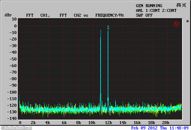 Headphone Output THD THD, Headphone output driving 600Ω resistor, undithered sine wave at 0 dBFS, 22 kHz measurement bandwidth. (CBS CD-1 track 11, R&S UPL.) No distortion here driving a resistor. So far, so good.