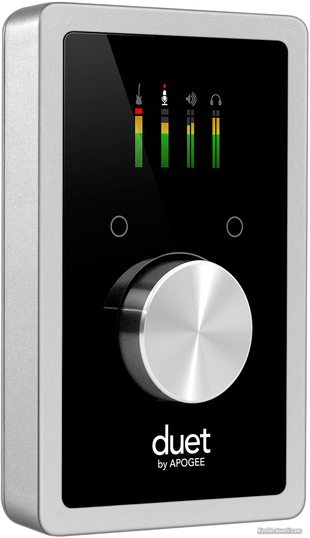 A MacBook, a Les Paul, AKG headphones and an Apogee Duet 2. The more I listen the better it sounds, but what hits you the moment you plug in your headphones is again how you can crank up the gain to live concert or studio playback levels and it sounds great, and how you can lower the levels to any other level with absolute precision and control — easily and immediately. As a professional recording product, remember that the Duet 2 is mostly sold to musicians who are going to record through it into their Mac (there are also two professional phantom-powered mic preamps and two 24bit/192k ADCs), and when they play it back, it had better sound as good — and as loud — as it just sounded live. The headphone output of the Duet 2 brings you back into the studio, even played-back from good transfers in iTunes. The headphone amp has no noise, and plays at any level up to and including deafening, even with 600 Ω headphones like the Beyer DT 880. There is always enough gain to hear details in even the quietest sections of classical recordings — and it's doing this powered only via USB. With sensitive headphones like Ultrasone Edition 8, the Duet 2 will play to beyond deafening (hey, it's a professional studio product). The headphone and the line (speaker) outputs both have enough gain to let you play the softest sections of classical recordings loudly enough to hear what's going on. If you want to hear the room noise in a classical recording, you're going to hear it. There are also four channels of color level meters, which are very handy if you are an engineer to know what levels are playing out of your Mac. For recording, the Mic preamps offer any amount of gain you'd like from 75 dB down to no gain at all (line level), with phantom power. You can mix and pan each line, mic or instrument input separately, or gang them together for stereo, all in the included Maestro 2 software. At 1 pound (500g) with a rubber bottom, it sits solidly on your desk, and it's small enough to pack in your bag to go anywhere. It's self-powered from USB, and even though the manual cautions that if you're playing low-impedance headphones way too loud that it might actually come up with a request to use the external power adapter, it never had a problem even when I stress-tested it in the lab at maximum sinewave output into 37.5 Ω. It's all about the big knob and the great sound. I can't find any legitimate way to criticize the Duet 2. Apogee really did their homework listening to what people wanted from the original Apogee Duet, and the seamless way the Duet 2 works really impresses the Dickens out of me. You have to use one to appreciate it, although Amazon's and B&H's user reviews also bear out that everyone loves this thing; and these people are musicians and recording engineers who know how music is supposed to sound. The fact that the Duet 2 sells for only $649 makes it a no-brainer for anyone needing to get audio out of or into their computer. It's all about performance from one of the world's leaders in music recording, without having to pay for any performance-robbing and price-raising fluff included in exotic (but still garage-shop) audiophile products. Thank goodness there are no annoying blue LEDs on the Apogee, just a nice color OLED panel. Apogee has been making the ADCs and DACs used in the world's top recording and mastering studios for decades. If I can get this quality on my desktop for $595 along with its fantastic ergonomics to control my desktop monitors and drive my headphones, how could I say no?