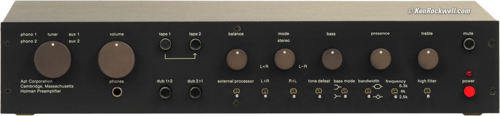 Perspective The Apt Holman Preamplifier is the most well thought-out stereo preamplifier ever designed. It was designed at the very height of recorded music's reign as the dominant form of home entertainment (home video was still years away), and was designed by none other than the brilliant Tom Holman, the inventor of 5.1 audio and the inventor of THX motion picture sound. The name "Apt" comes from its definition as "an appropriate and intelligent solution to the task at hand." Newer preamplifiers today are mostly 25-pound billet aluminum cases filled with fluff: ordinary analog circuits controlled digitally with showy vacuum fluorescent displays, but missing many of the important control features and superior audio performance of the Holman Preamplifier. Instead of chasing idiotic things that consumers think are important but aren't, like what kind of wire's inside, the Apt Holman Preamplifier concentrates on what's far more important, like where those wires are connected and the analog circuity around them.
