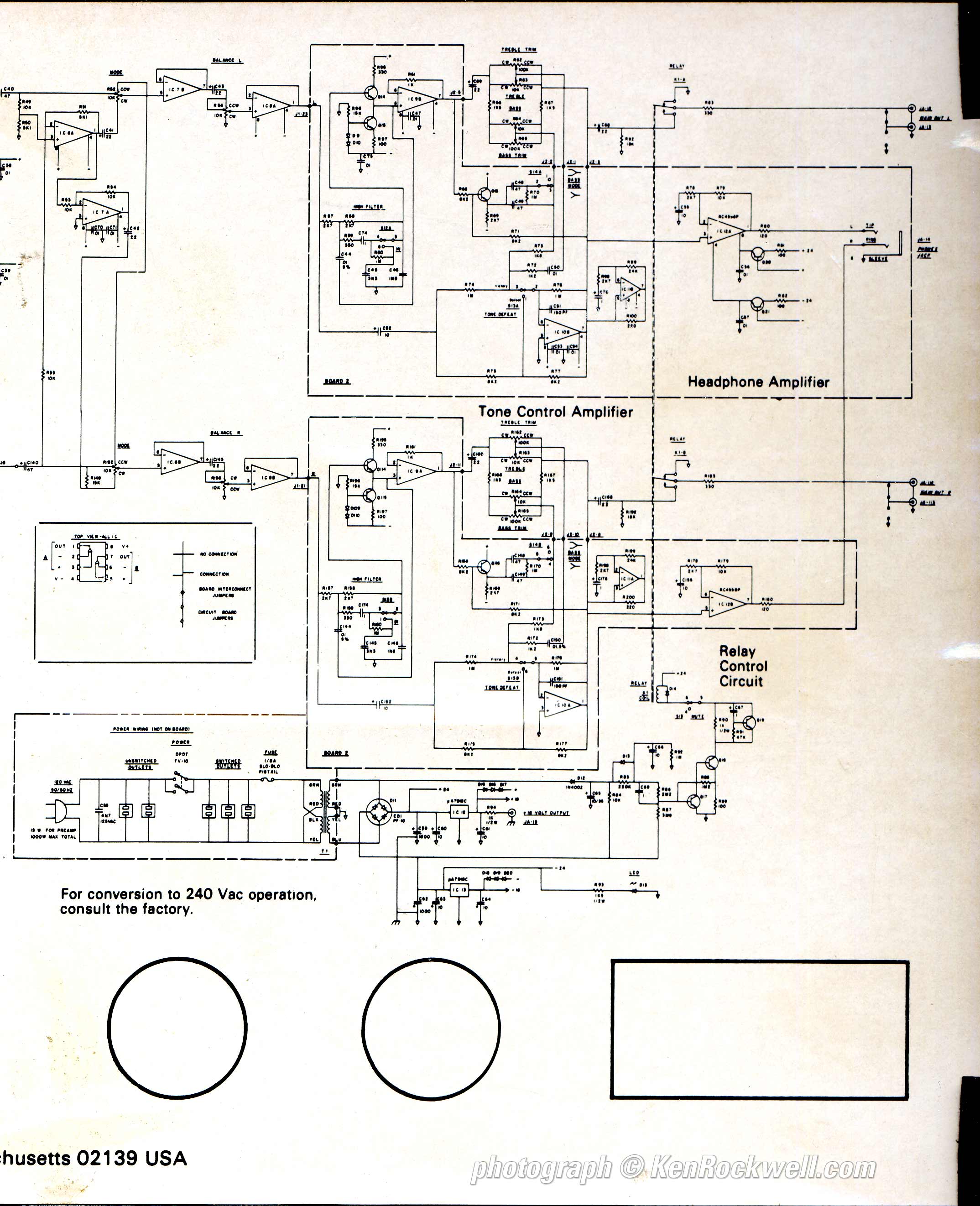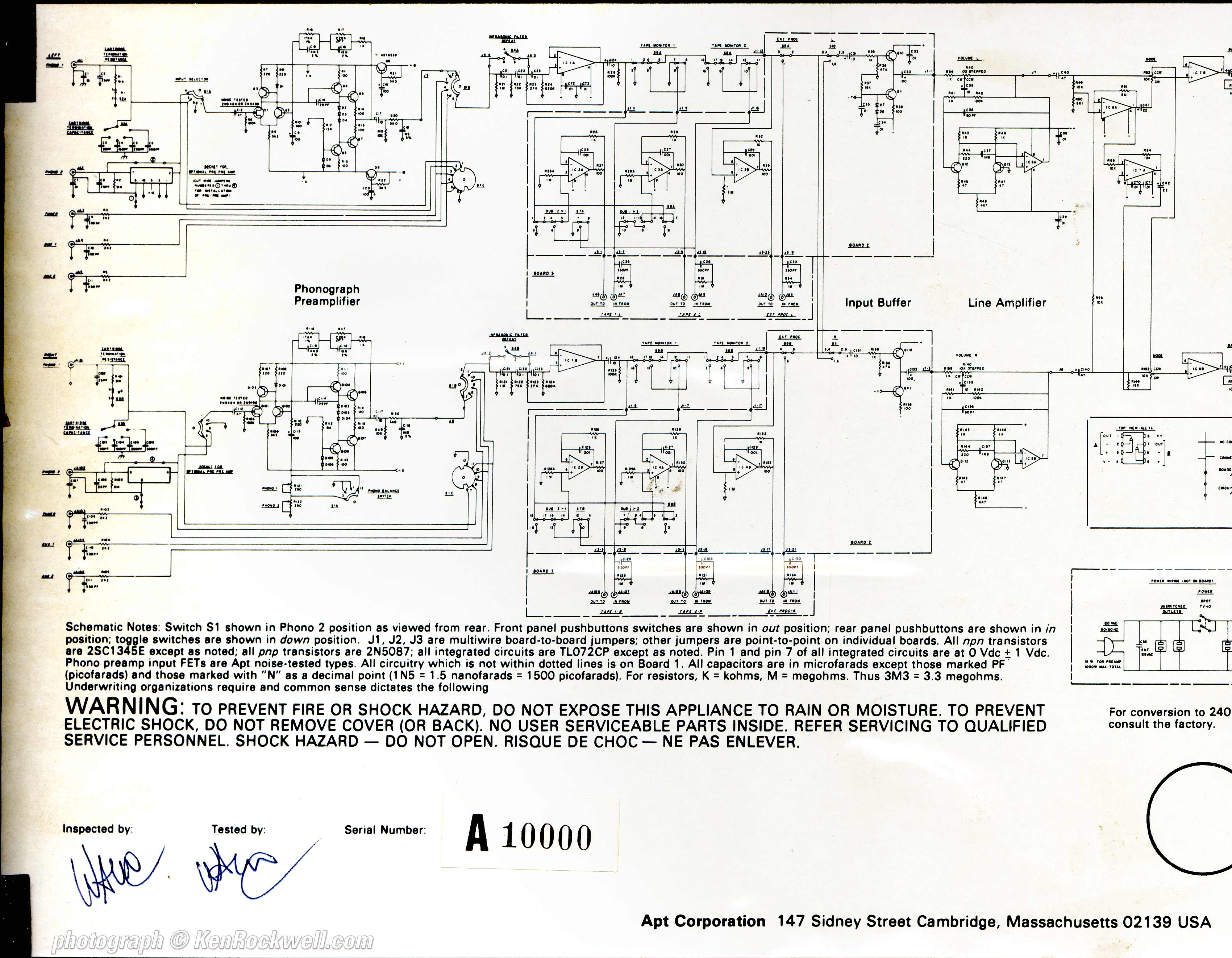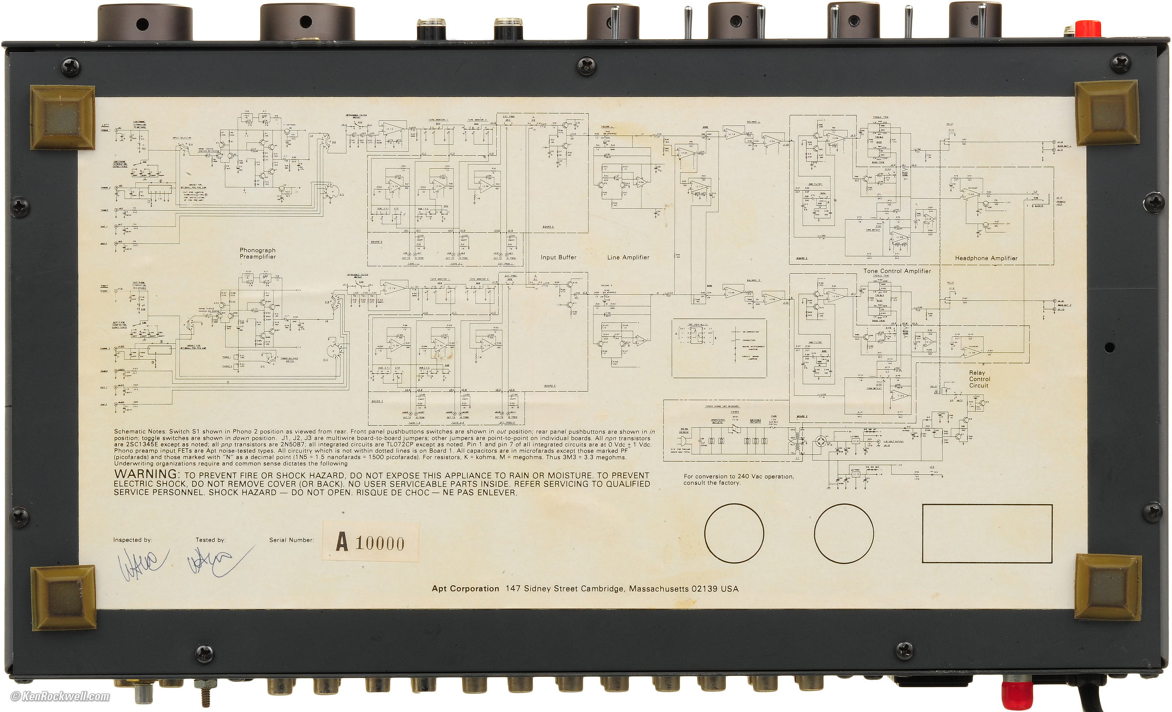 It's attached to the bottom, hand-signed by the man who inspected your preamplifier, and hand-signed by the man who tested it. Bottom, The Apt Holman Preamplifier. enlarge. For detailed blow-ups, here's the left side and the right side.