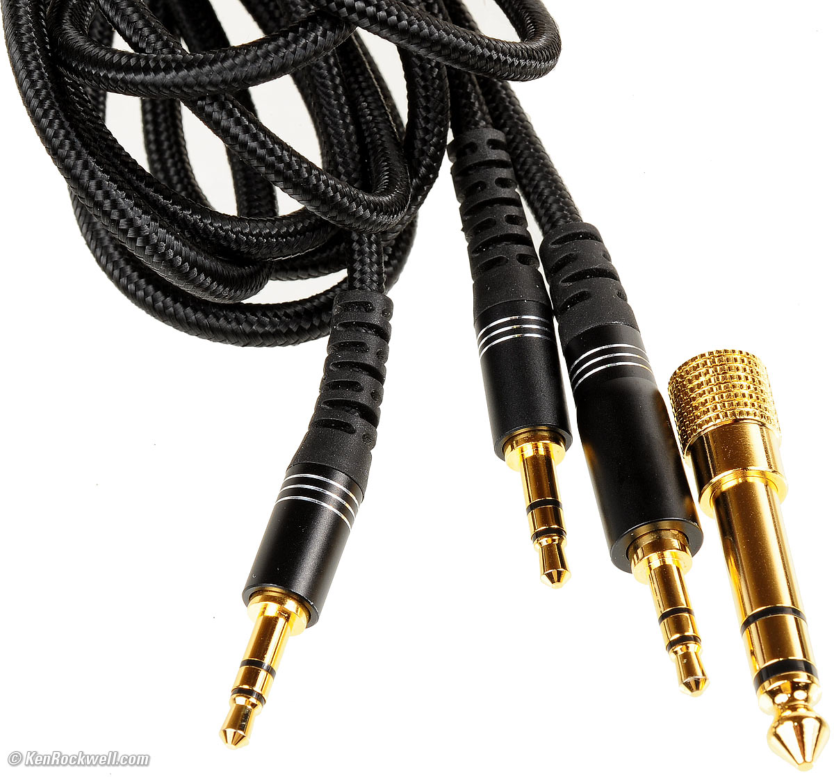 Cord specifications topIncluded cord, Audeze LCD-1. bigger. 7-foot (2.1 meter) cloth-covered straight cord with three 3.5mm stereo plugs. Metal plug grips with plastic strain reliefs. Three 3.5mm stereo plugs, and here's the secret part: plug any of the three into any of your source or the left or right earpieces and it all works great, there's no need to worry about which plug goes to which side because each earpiece connects only to its relevant terminals. All the plugs are wired the same and it works however you plug it in, no fiddling needed. Bravo!
