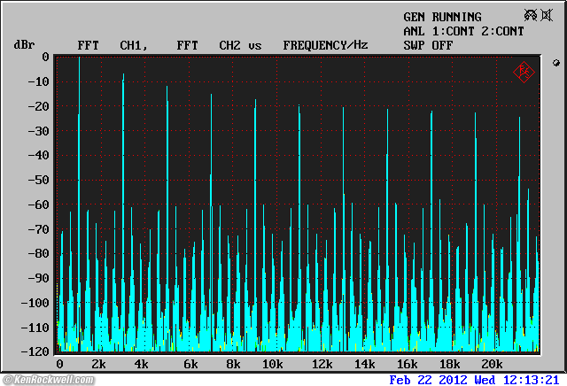 THD: 0.0003% (-110 dB) measurements top Harmonic components, unbalanced output at maximum gain, 1kHz at -1 dBFS, 96k/24-bit file via iTunes via TOSLINK. (R&S UPL.)