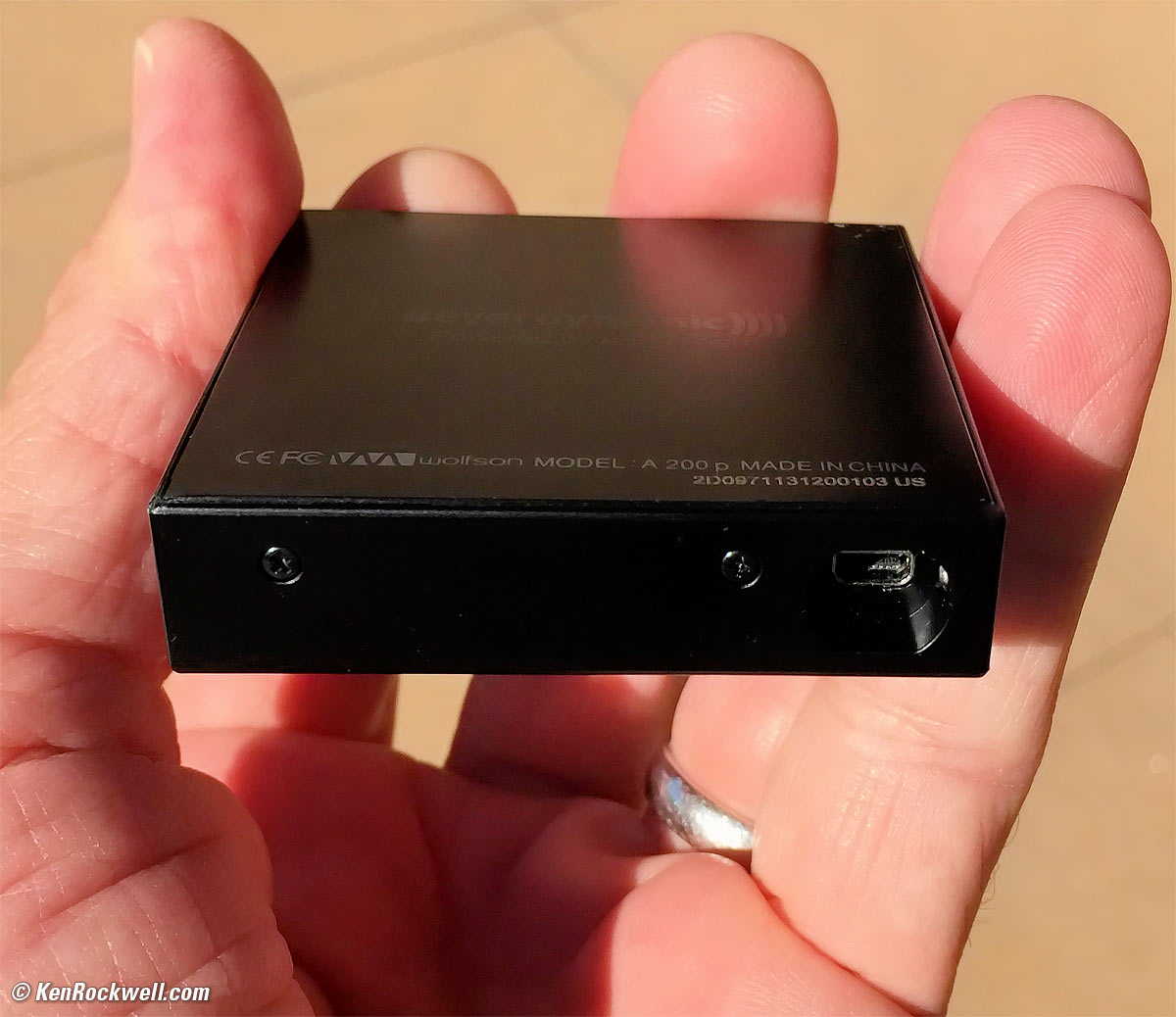 The Beyerdynamic A200p is a tiny 24-bit, 96 ksps DAC and headphone amplifier. It's the size of a large postage stamp. The big silver circle is the volume control; spin it with your finger. It's powered by its own internal 11-hour battery or USB. The battery charges via USB. If you use it at your work computer during the day, it will be charged for you to use on the commute home, use all evening and then for the commute back; all at your boss' expense to recharge the next day! It uses either an iOS device, computer USB or Android as its digital input. It comes with an Apple Lighting cable for use with modern iOS devices, a micro USB cable for Androids, and a USB cable for charging and playback from a computer. It works both as a portable DAC and amp, as well as on your desk as a DAC and/or headphone amplifier. Better, Velcro it under your desk for a neat, hidden remote headphone jack or speaker volume control. To control speakers, plug its output into powered speakers or your power amplifier. While mostly for portable use, I find it very helpful in my office because my desktop 2014 Mac Pro sits up at the back of my desk, with its headphone jack facing away from me. Even if I wanted to reach around to plug in my Beyerdynamic T51i or other portable headphones, the cord won't reach. I put this tiny amp on my desk, and the problem is solved. It has 4.6 dB (about 1 or 2 clicks) more output than an iOS device when used as an input to an amplifier or preamplifier, or with high impedance (300 Ω and above) headphones. The A200p has less clean maximum output than an iPhone 6 Plus when used with 32 Ω headphones.